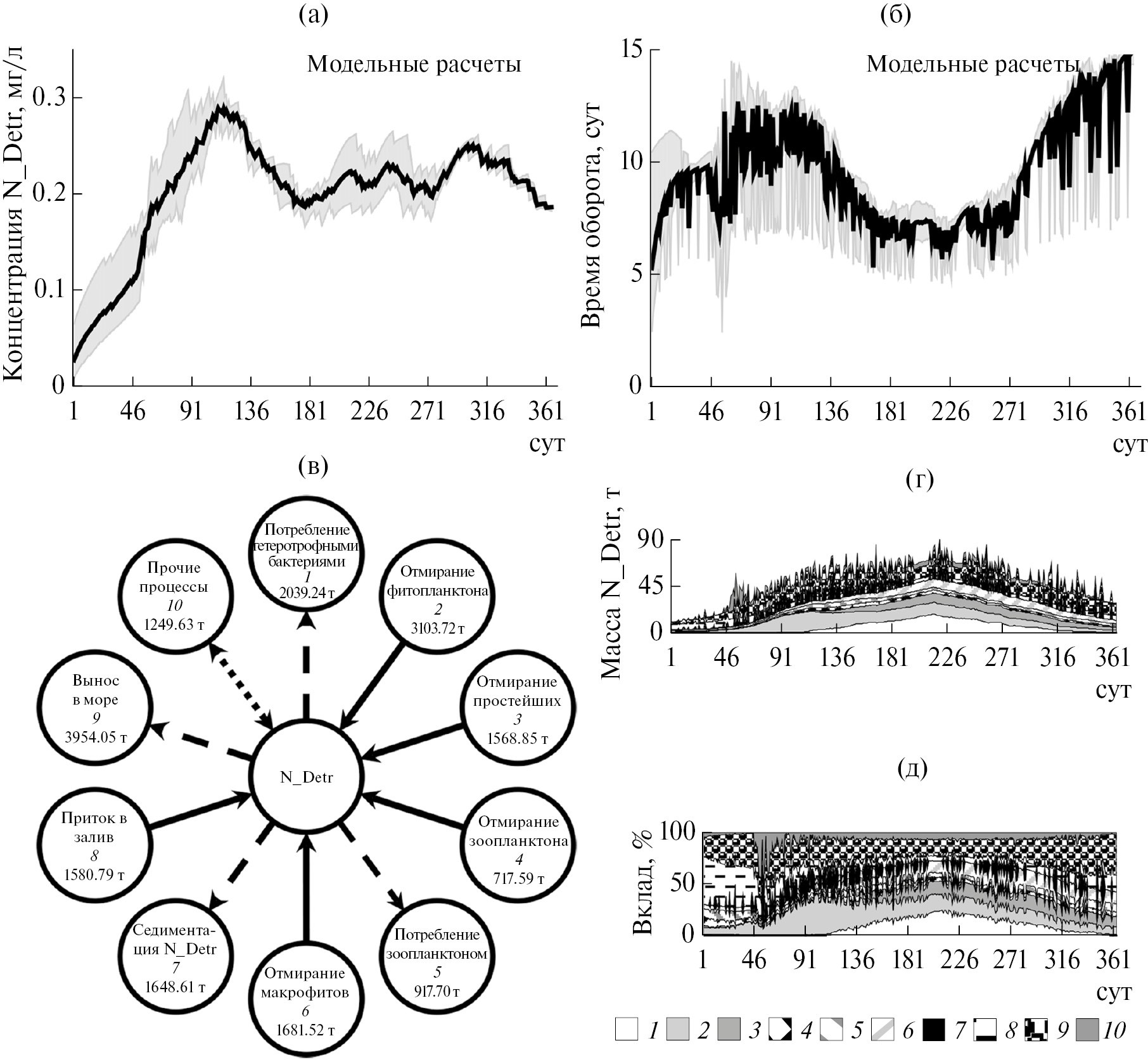 Рис. 3. Результаты моделирования внутригодовой динамики растворенного органического азота: а ‒ концентрации DON, времени оборота (б) и составляющих баланса DON (значения даны в т/год) (в‒д) в экосистеме ВЗ. Здесь и на рис. 4‒10: а, б ‒ сплошными черными линиями даны средние многолетние значения концентраций на каждые сутки года, серым цветом – пределы изменчивости концентраций; в ‒ черными сплошными стрелками показаны те составляющие баланса, которые увеличивают содержание того или иного соединения азота или фосфора, черными прерывистыми стрелками – те, которые уменьшают, черными прерывистыми двойными стрелками – те, которые могут как уменьшать, так и увеличивать; цифрами в кружках обозначена нумерация составляющих баланса, названия которых даны в каждом кружке. Эта же нумерация использована на (г) и (д).