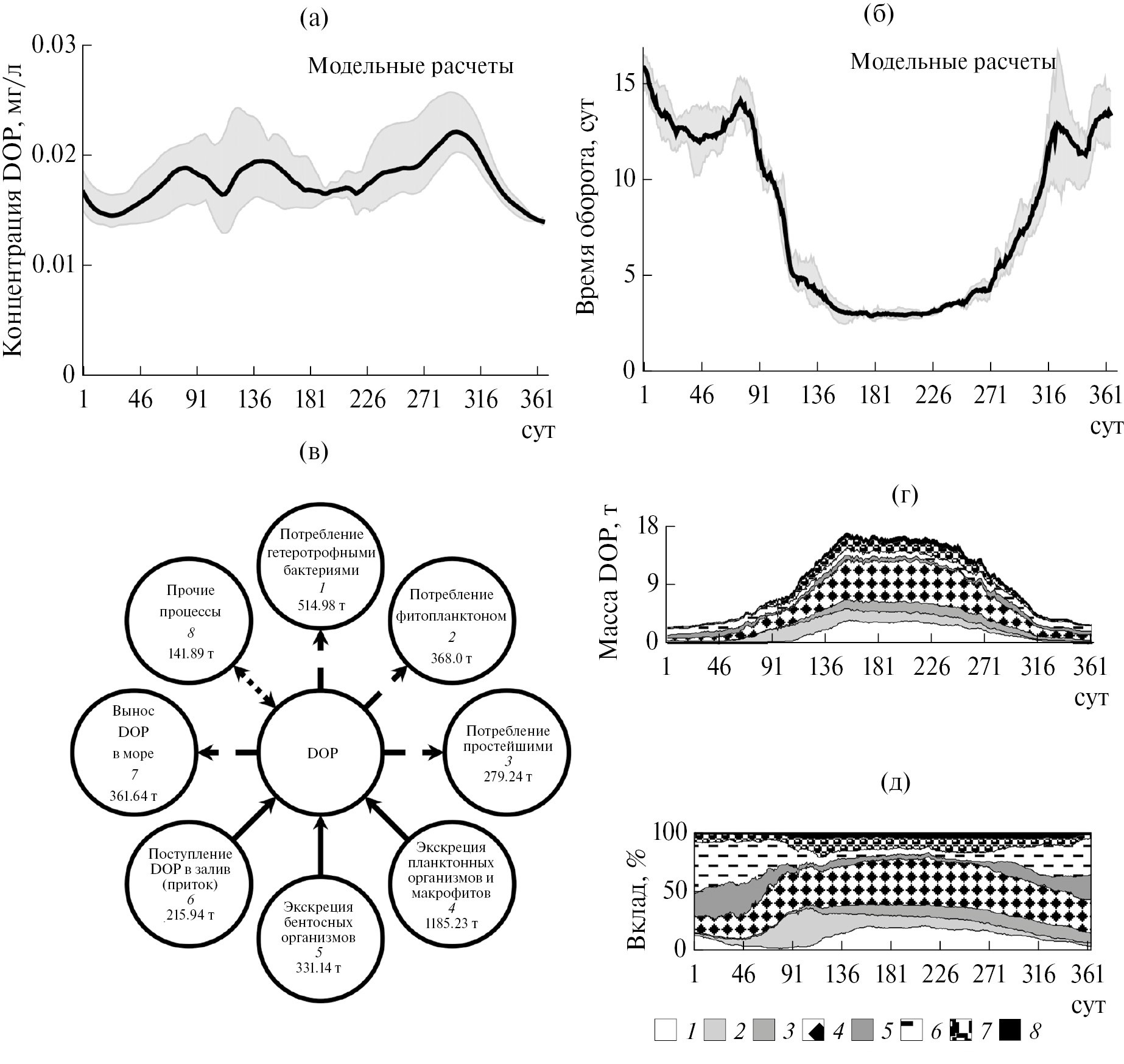 Данные моделирования свидетельствуют, что наиболее важный источник поступления DOP в водную среду ВЗ – процесс экскреции РОВ планктонными организмами и макрофитами. По сравнению с этим экскреция DOP бентосными организмами меньше в 3.6 раза, а поступление DOP с речным стоком – в 5.5 раз. Наиболее важные процессы, которые приводят к уменьшению содержания DOP в водной среде, – потребление DOP гетеротрофными бактериями, фитопланктоном и простейшими, а также вынос DOP из залива в море. В суммарном годовом балансе потребление DOP простейшими – ~50% суммарного потребления DOP гетеротрофными бактериями.