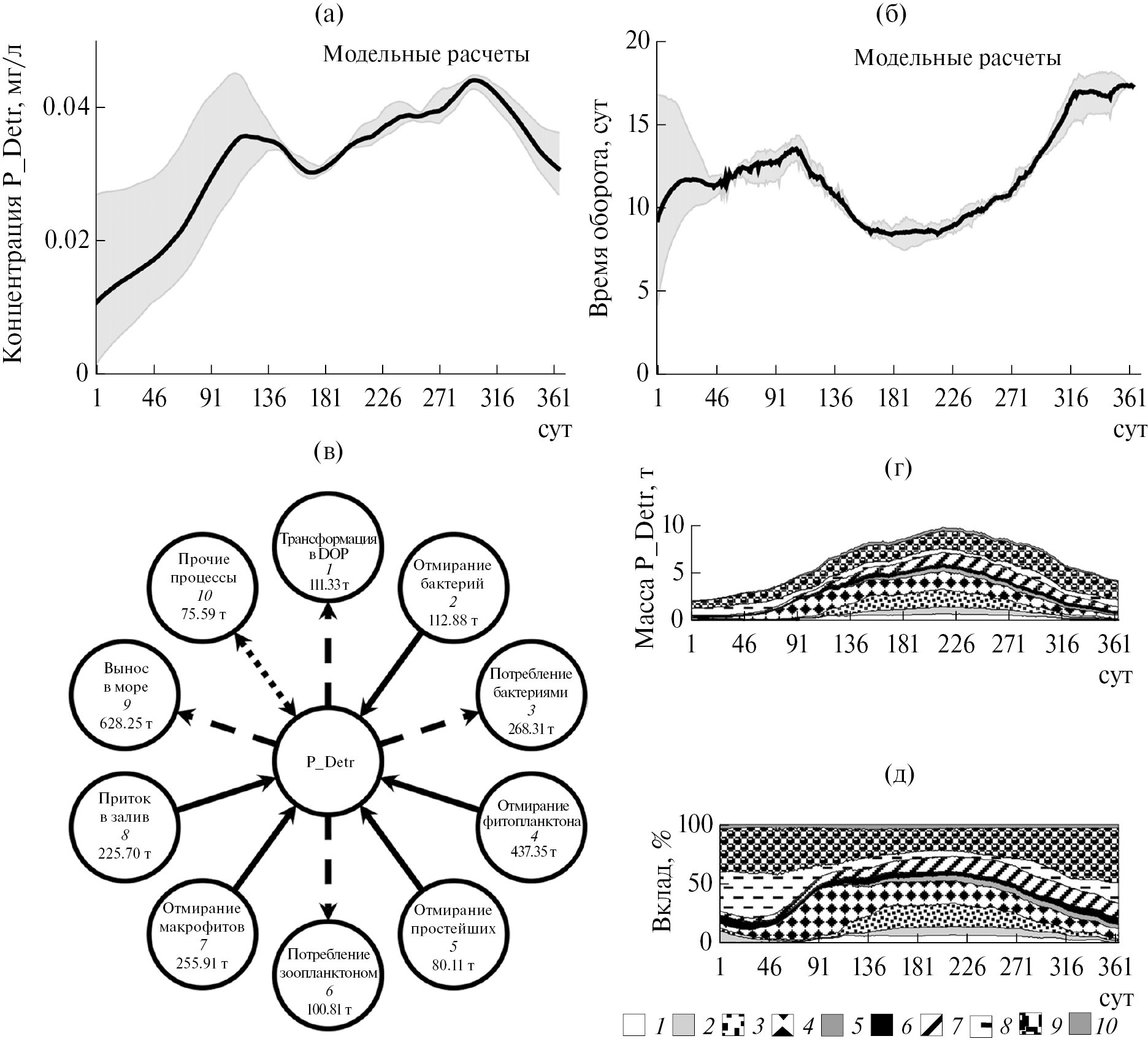 Рис. 10. Результаты моделирования внутригодовой динамики концентрации (а) фосфора в составе детрита (P_Detr), времени оборота (б) и составляющих баланса (в‒д) P_Detr в экосистеме ВЗ.