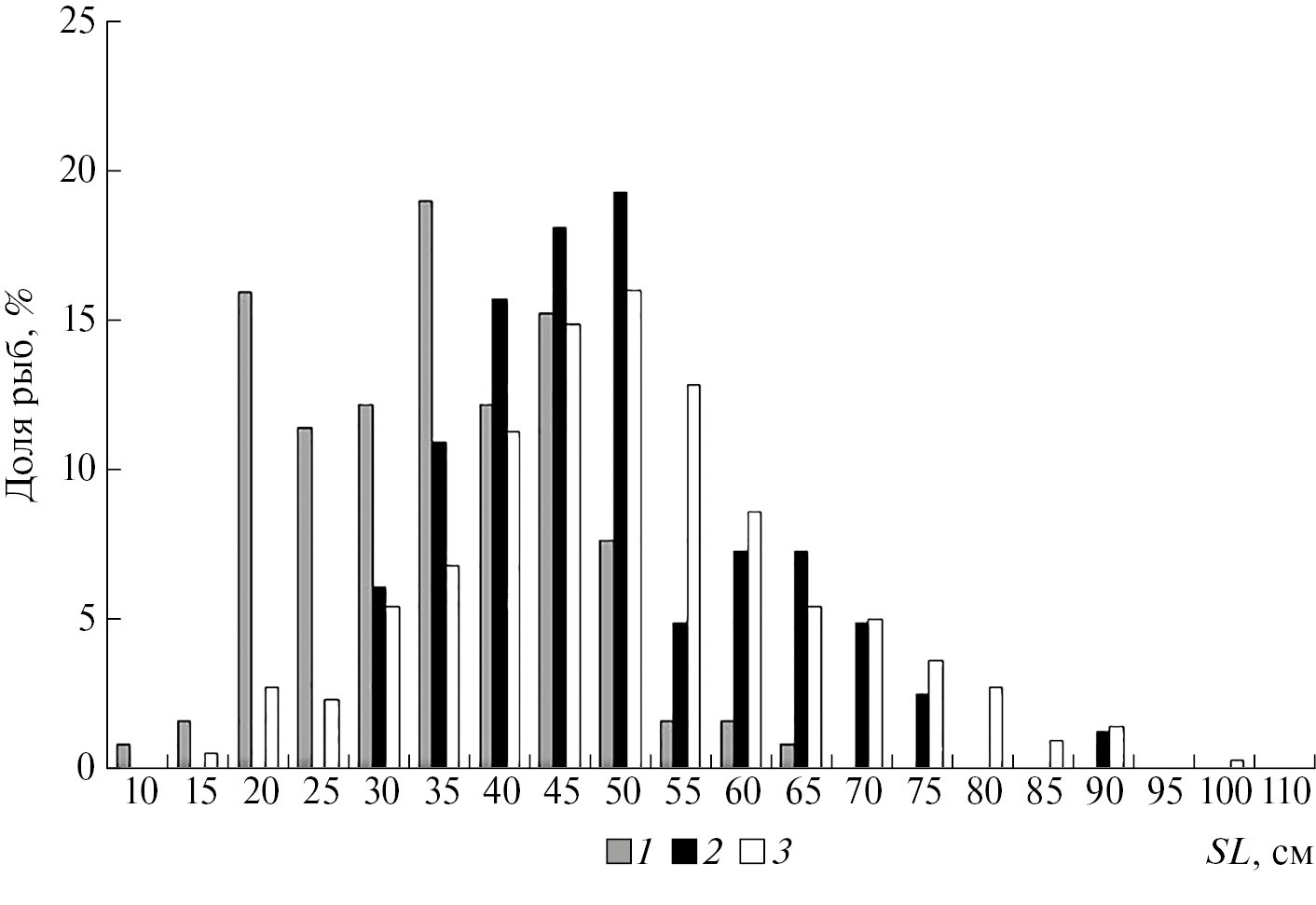 Рис. 5. Размерный состав щуки (SL, см) в уловах неводом (1), тралом (2) и сетями (3) в Рыбинском водохранилище в 1953–2015 гг.