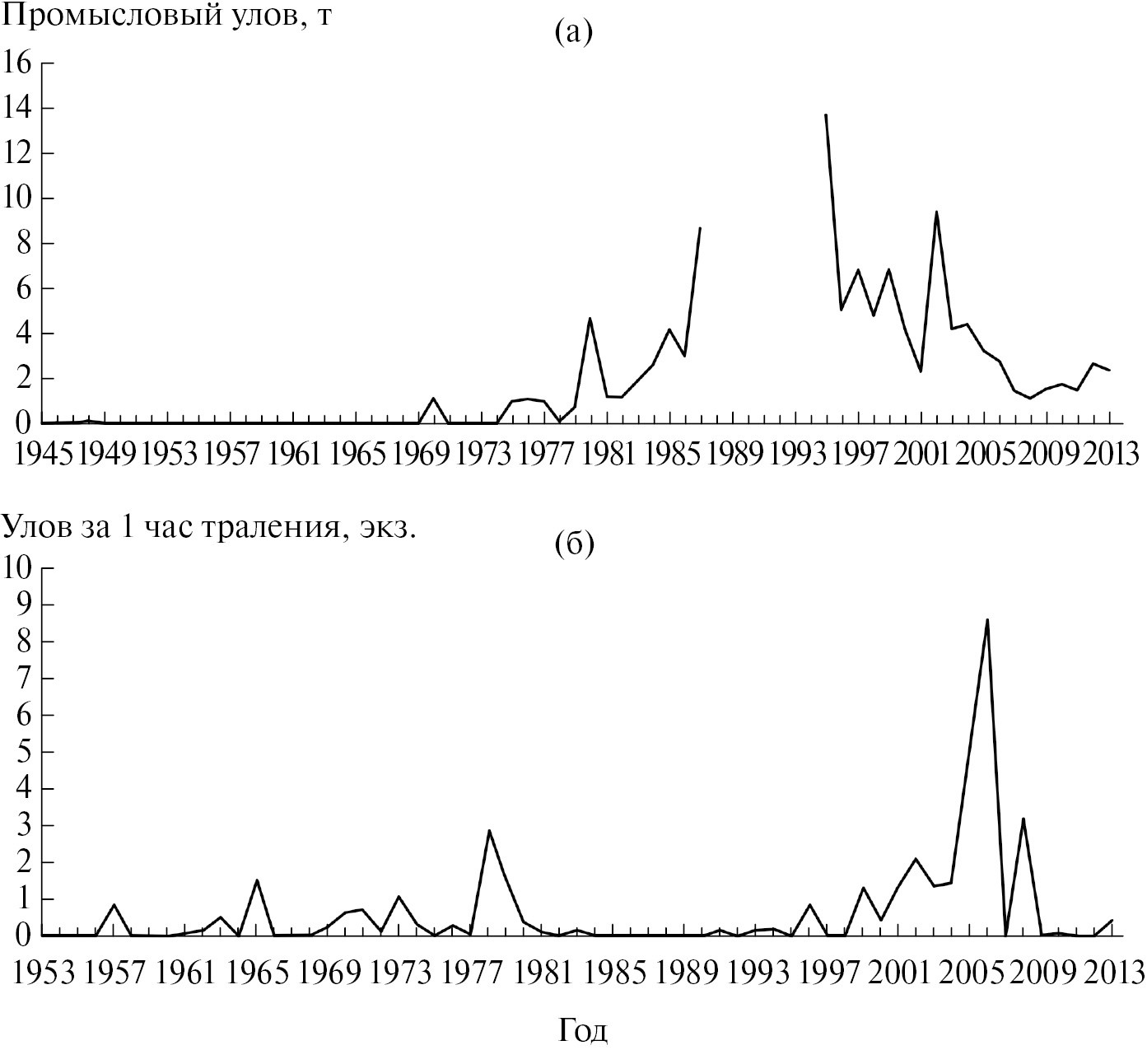 Обыкновенный сом (Silurus glanis (L., 1758)), очевидно, единственный вид, на популяцию которого потепления климата не оказало негативного воздействия. Этот вид всегда был относительно редок на Верхней Волге, Рыбинское водохранилище – северная граница его ареала. В настоящее время, с потеплением наметилась тенденция к некоторому увеличению его численности. На это указывает промысловая статистика (рис. 10а), а также данные учетного лова Института биологии внутренних вод РАН (рис. 10б).