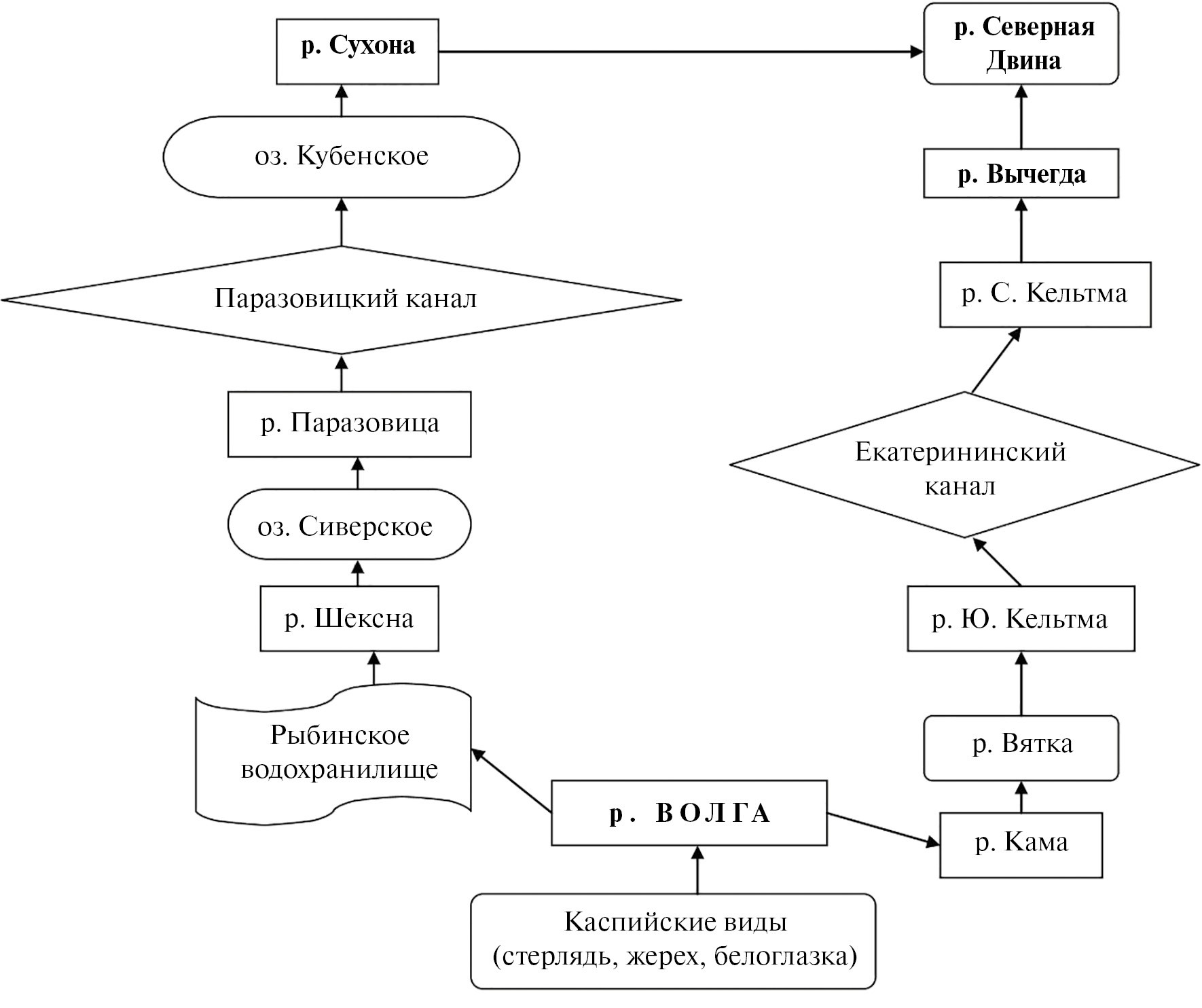 Рис. 4. Возможные пути саморасселения каспийских теплолюбивых видов рыб в бассейн р. Северная Двина (по: Новоселов, Студенов, 2002). Жирным шрифтом выделены основные магистральные реки (водные пути).