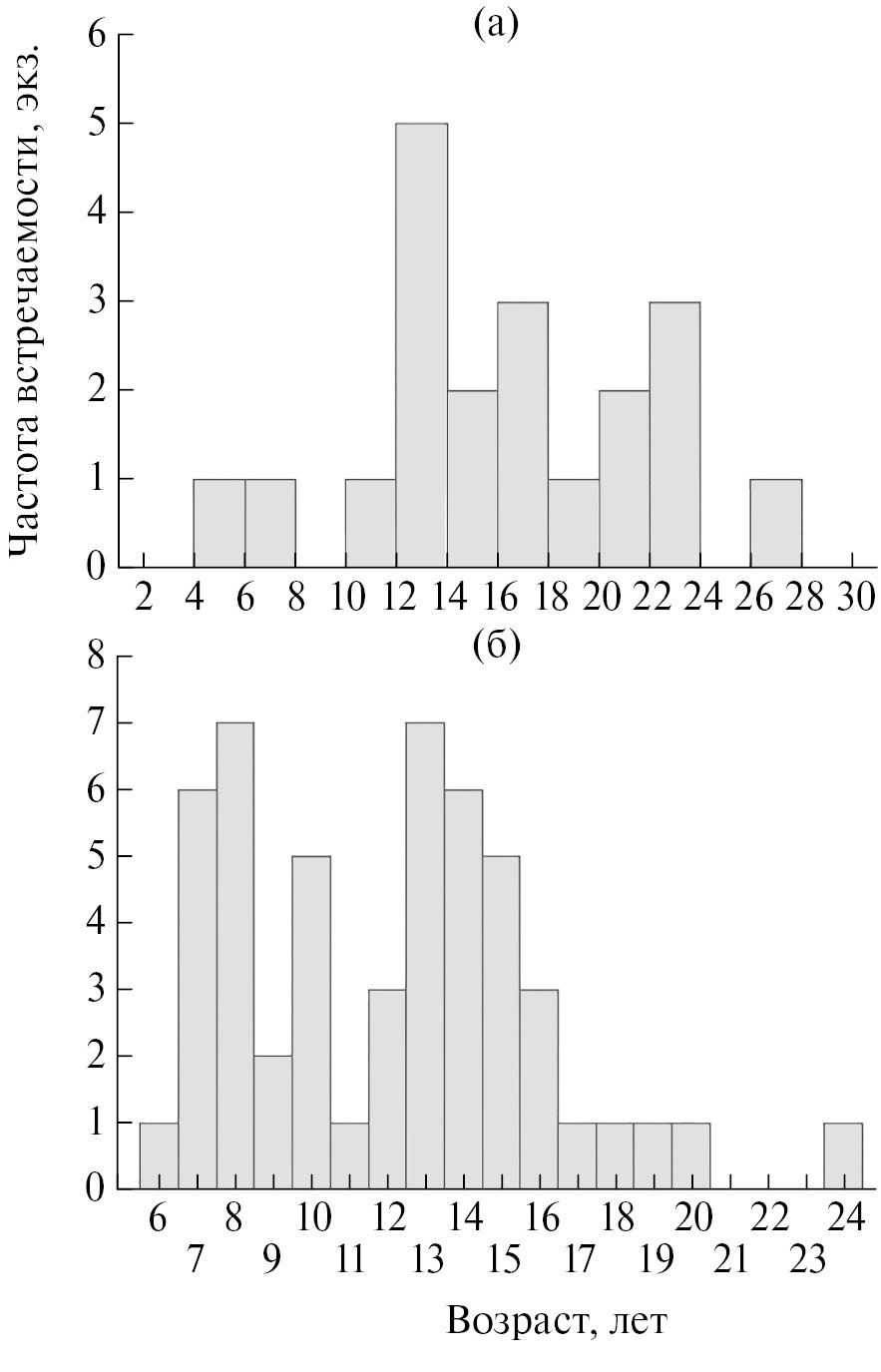 Рис. 1. Распределение частот встречаемости русского осетра по возрасту из ННН-уловов в нижнем течении р. Урал: а – самки, б – самцы.
