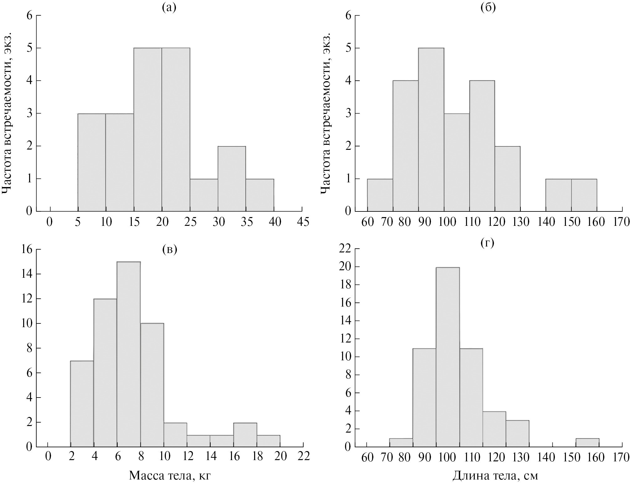 Рис. 2. Распределение частоты встречаемости самок (a, б) и самцов (в, г) русского осетра по массе (а, в) и длине (б, г) в ННН-уловах р. Урал.