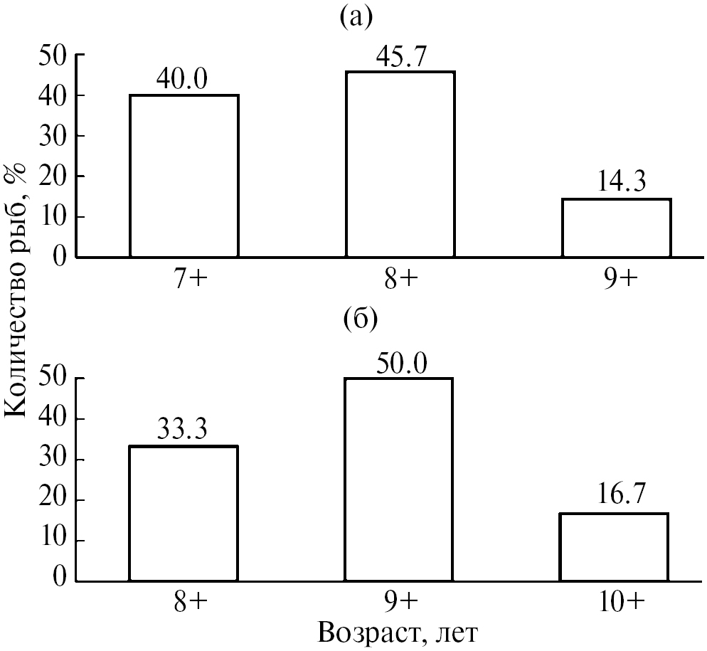 Abramis sapa Pallas, 1814 – вид, саморасселившийся в Северодвинском бассейне. По результатам мониторинговых исследований в 2019 и 2020 гг., средняя длина (AD) в р. Северная Двина была 20.3 см, изменяясь в пределах 19.0–20.3 см; масса рыб варьировала от 114.0 до 221.0 г (в среднем 139.6 г). Возрастной ряд проанализированной выборки представляли возрастные группы от 7+ до 9+ лет, с преобладанием рыб в возрасте 7+ и 8+ лет (>85% от всей выборки) (рис. 5а). Средний возраст самцов достигал 7.4 года, самок – 7.9 лет, по обобщенной выборке – 7.7 лет. Репродуктивную часть популяции белоглазки в период проведения исследований представляли самцы и самки на II стадии зрелости гонад с двукратным преобладанием самок.