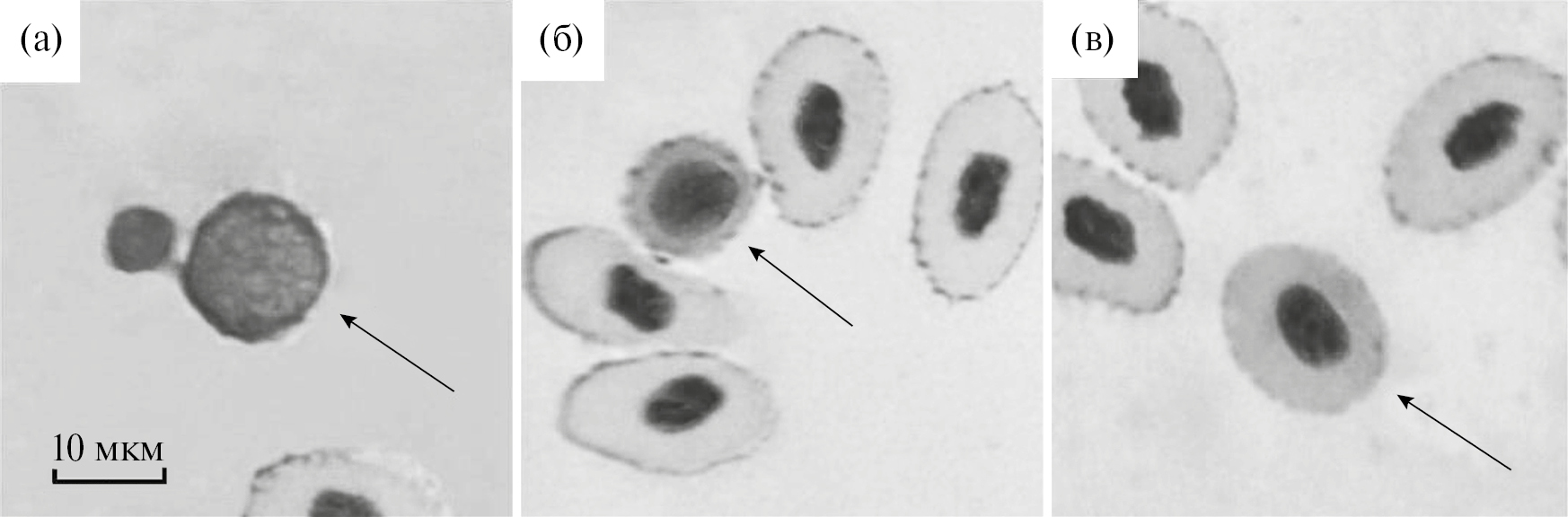 Рис. 1. Эритроидные элементы крови и головной почки камбалы-глоссы: a – ЭБ; б – БН; в – ПН (показаны стрелкой).
