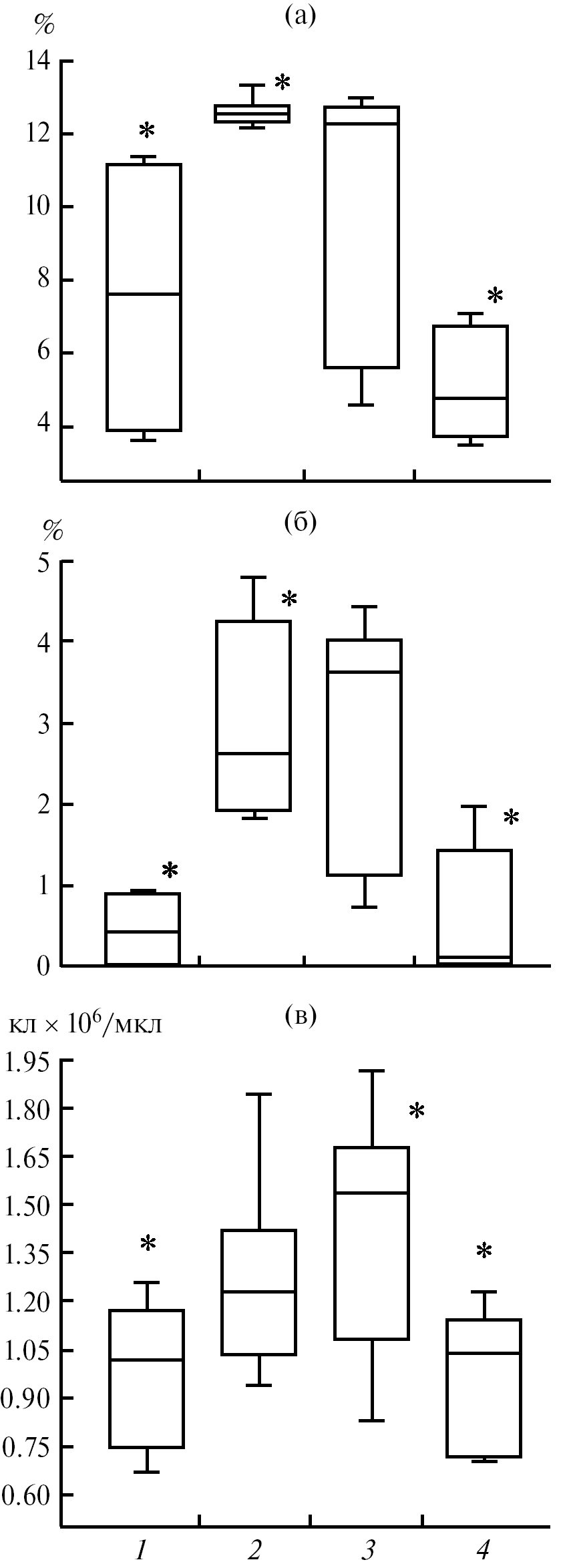 Рис. 3. Уровень незрелых эритроидных форм в пронефросе (a), крови (б) и число циркулирующих эритроцитов в крови (в) у камбалы-глоссы на протяжении годового цикла (ранжирование с шагом 3 мес). 1 – нерестовый период, 2 – постнерестовый период, 3 – относительный функциональный покой, 4 – преднерестовый период, * – достоверно (при p <0.001).