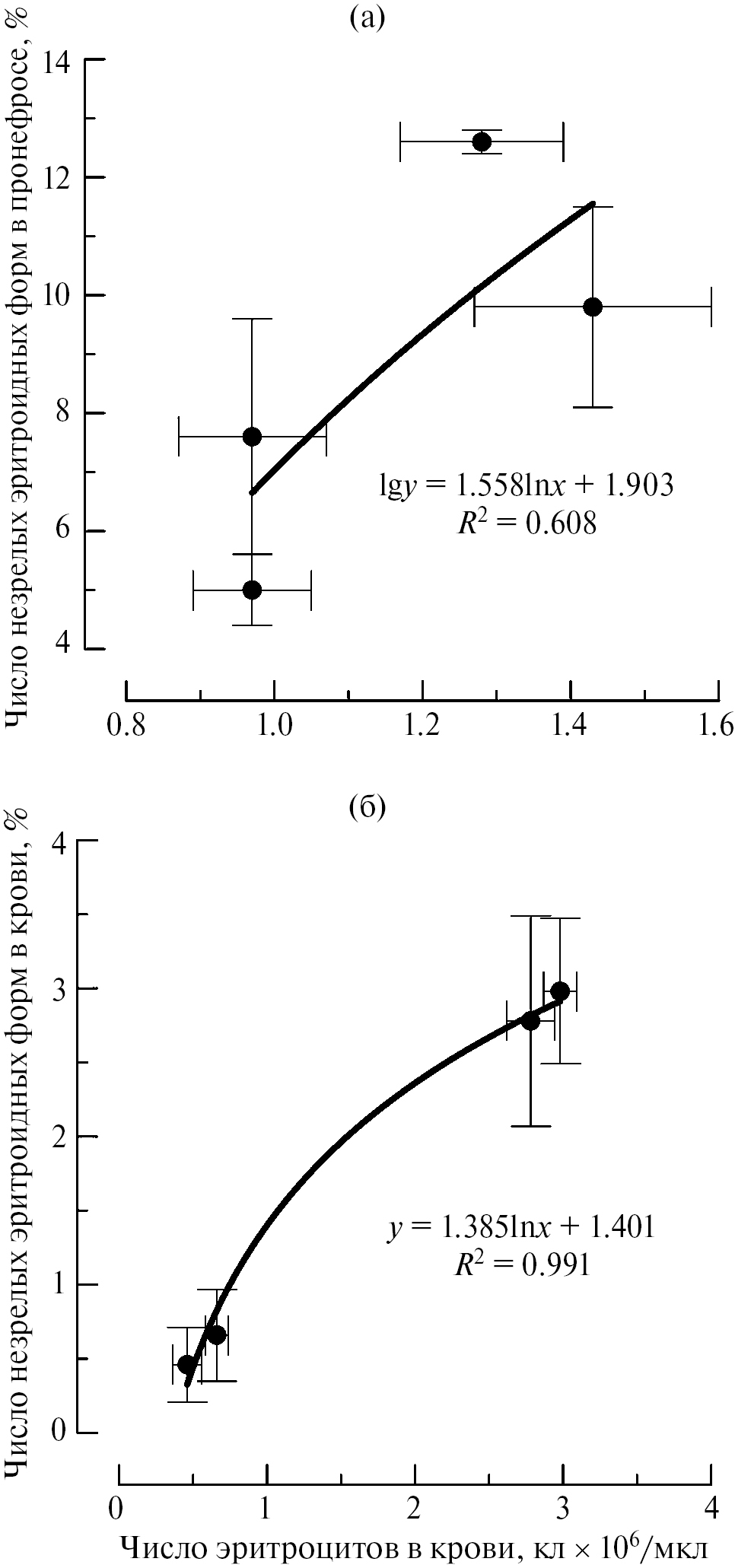 Для оценки влияния эритропоэтических процессов на динамику числа эритроцитов в крови камбалы-глоссы проведен корреляционный анализ в отношении систем: “незрелые эритроциты пронефроса – число эритроцитов в крови”, “незрелые эритроциты крови – число эритроцитов в крови” (рис. 4). В первом случае зависимость описывали уравнением логарифмической функции при коэффициенте детерминации (R2) 0.608, во втором – использовали уравнение экспоненциальной функции при R2 0.991. Более низкая степень зависимости величин в первом случае, по-видимому, определяется тем, что активация эритроидного ростка гемопоэза и прирост числа эритроцитов в крови разнесены во времени. Первая переменная на 2–3 мес опережает вторую, что видно из графика. Максимум числа незрелых эритроидных элементов в пронефросе наблюдается в апреле–июне, тогда как число эритроцитов в крови достигает высоких значений только в июле–сентябре.
