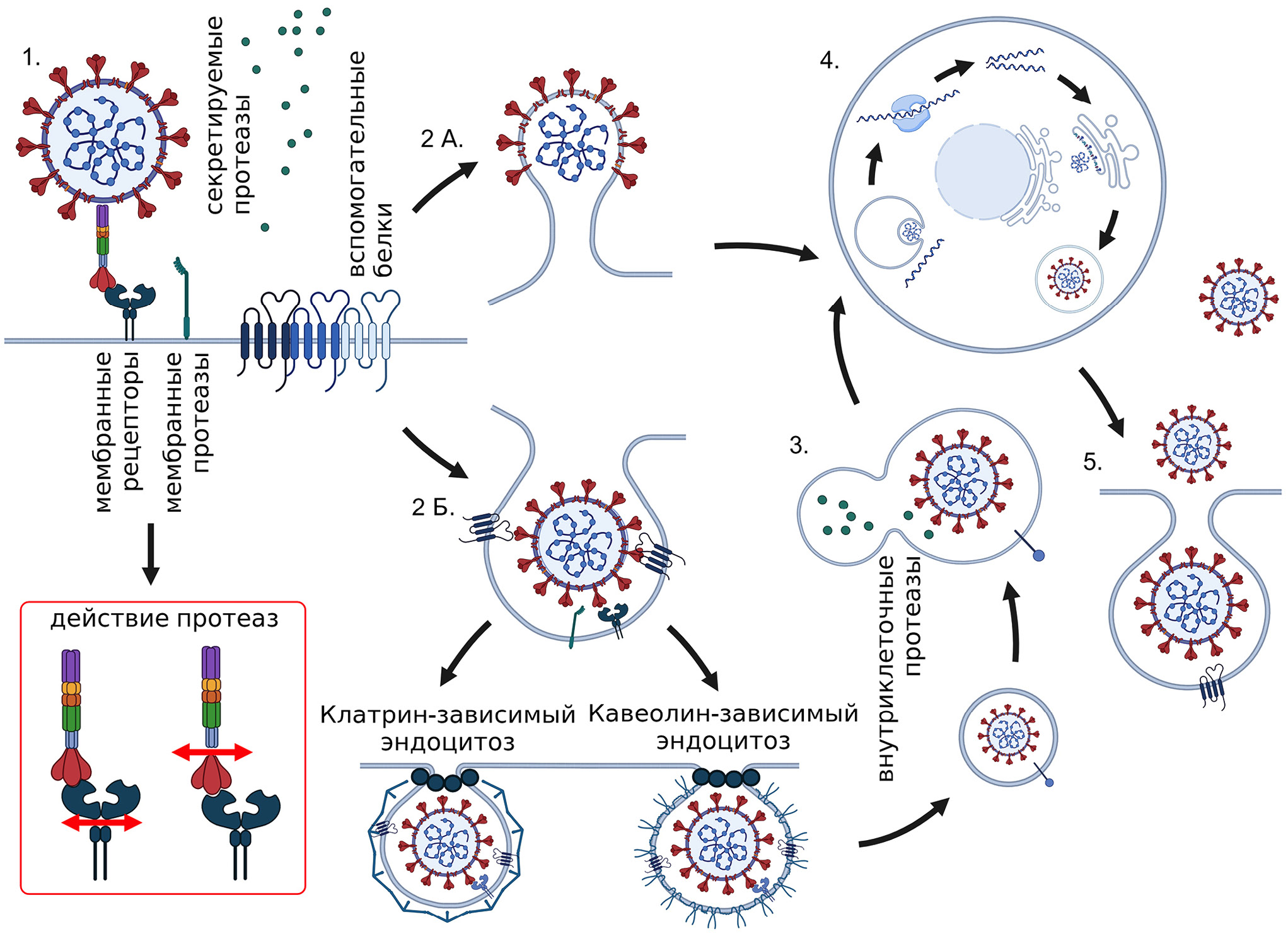 Слияние вирусной и клеточной мембраны зависит от белков слияния, дестабилизирующих мембрану и формирующих пору, по которой содержимое вириона высвобождается в цитозоль клетки. S-Белок SARS-CoV-2 принадлежит к первому классу белков слияния – для его активации необходимо протеолитическое расщепление, в результате которого происходит конформационная перестройка, формирование N-концевой суперспирали, экспонирование и встраивание вирусного белка в мембрану клетки-хозяина.