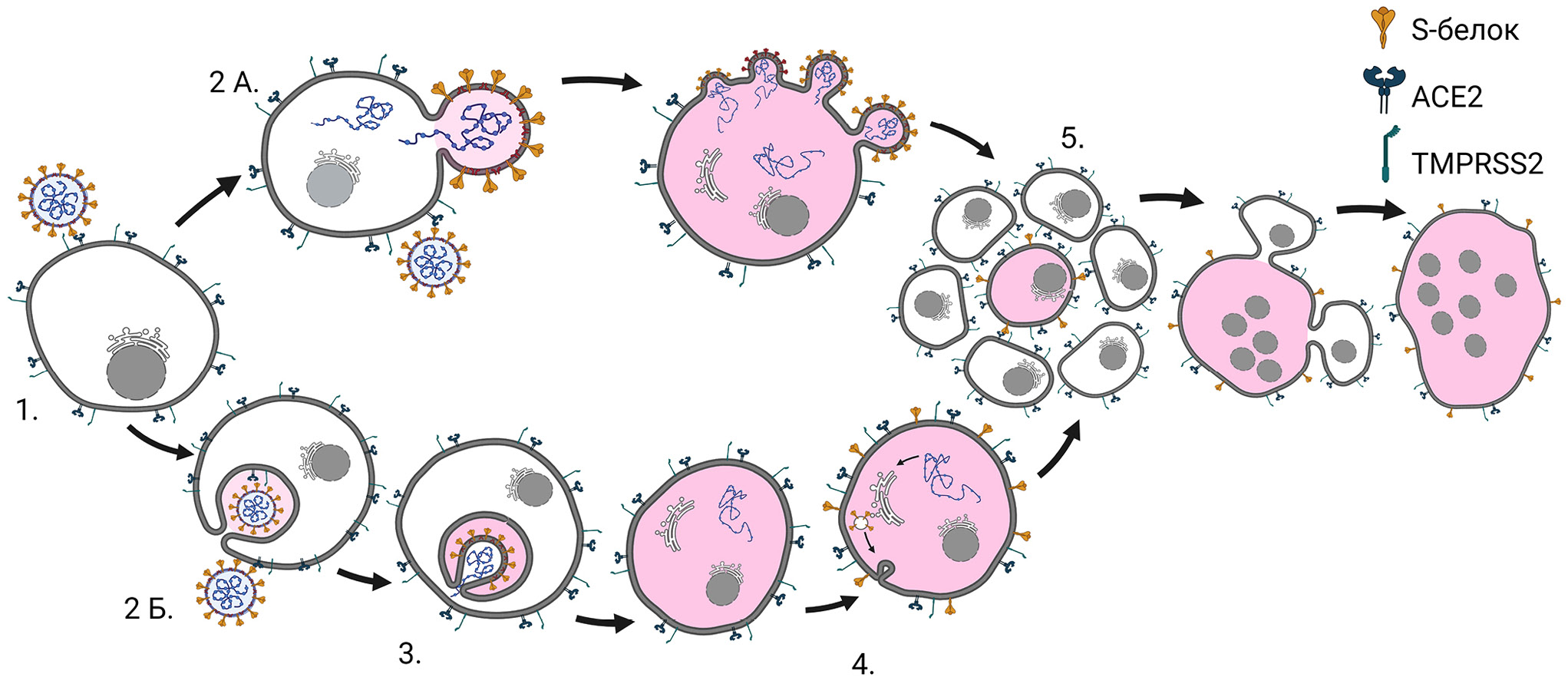 Рис. 2. Схематическое представление формирования многоядерного синцития при инфицировании клеток SARS-CoV-2. Вход вируса в клетки запускается в результате взаимодействия между S-белком вируса и рецептора ACE2 клетки (1). Появление S-белка на плазматической мембране происходит при слиянии вириона с клеткой (2 А) либо при инфицировании по эндосомальному пути (2 Б). В этом случае благодаря низкому рН в эндосоме происходит протеолитическое расщепление S-белка (3), высвобождение генома, его репликация и синтез вирусных белков в эндоплазматическом ретикулуме (4). Часть S-белка ввиду его структурных особенностей транспортируется и встраивается в плазматическую мембрану. Таким образом, наличие на мембранах соседних клеток молекул слияния АСЕ2 и S-белка способствует их слиянию (5). Сокращения: АСЕ2 – ангиотензинпревращающий фермент 2, TMPRSS2 – трансмембранная сериновая протеаза 2
