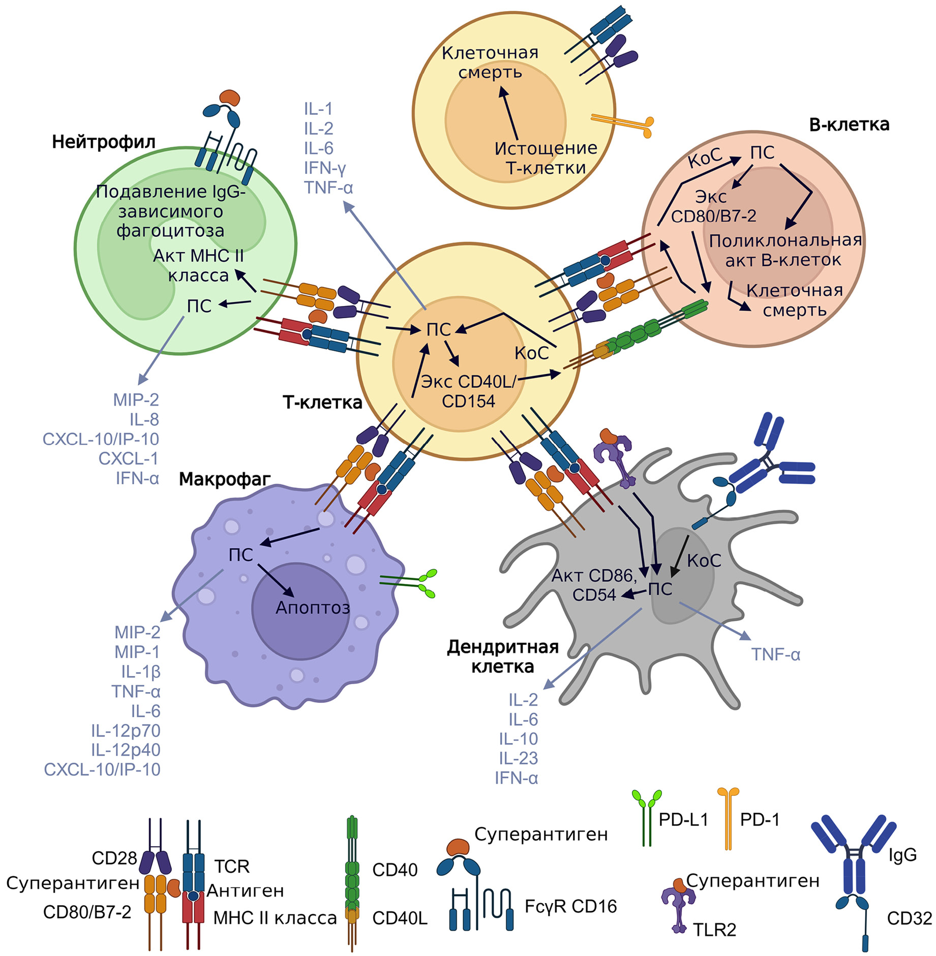 Принятые сокращения: АПК – антигенпрезентирующие клетки; БАЛ – бронхоальвеолярный лаваж; MHC – главный комплекс гистосовместимости; СВЦ – синдром высвобождения цитокинов; ЭПР – эндоплазматический ретикулум; ACE2 – ангиотензинпревращающий фермент 2; ADE – антителозависимое усиление; RBD – рецептор-связывающий домен; SARS-CoV-2 – коронавирус 2, вызывающий тяжёлый острый респираторный синдром; ТЕМ – плазматические мембраны, обогащённые тетраспанинами; TMPRSS2 – трансмембранная сериновая протеаза 2.
