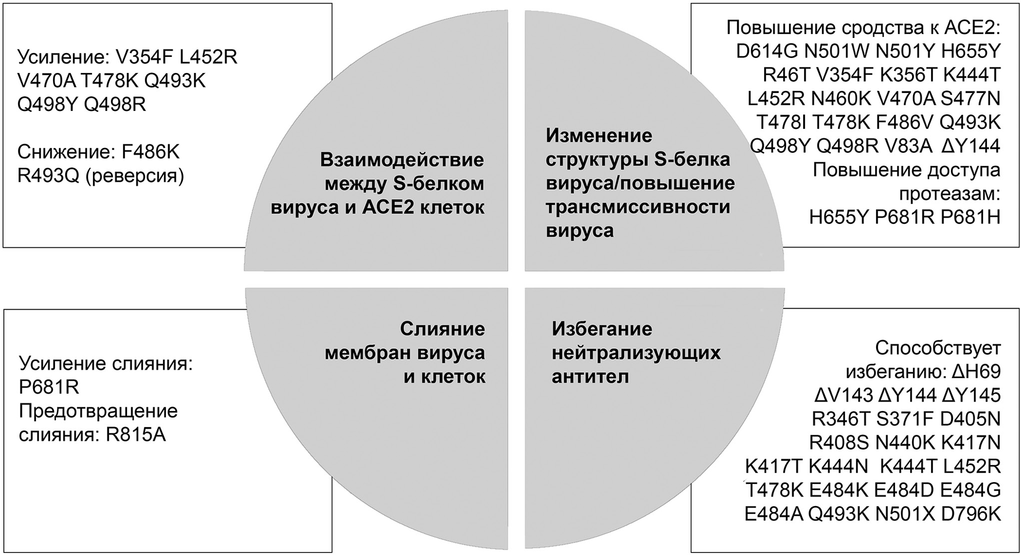 Были проанализированы выявленные в различных вариантах вируса и потенциально возможные мутации S-белка (рис. 5). Показано, что замена T478I может повысить сродство S-белка к рецептору ACE2 человека и вероятность взаимодействия с рецептором ACE2 домашних животных (кур, кроликов, грызунов) [71]. Cродство шипового белка к ACE2 также повышают замены V354F, V470A [72], T478K и L452R [15] и Q498Y [73]; тройная замена (T478K, Q493K и Q498R), выявленная в варианте Омикрон, усиливает электростатическое взаимодействие между шиповым белком и рецептором ACE2 [74]. В то же время показано, что по способности к слиянию с мембраной, в целом, наиболее эффективны варианты Альфа, Гамма и Дельта, тогда как Омикрон сопоставим с исходным вариантом вируса [75]. Вирус варианта Омикрон (B.1.1.529) входит в клетки за счёт связывания с рецептором АСЕ2, но при этом независимо от мембранной протеазы TMPRSS2. Как показывают исследования на животных моделях, он в большей степени оседает в верхних отделах дыхательных путей, где происходит его репликация и наработка вирусных частиц [76]. Возможно, это отчасти объясняет его высокую трансмиссивность (практически равную трансмиссивности кори), когда вирус воспроизводится в верхних дыхательных путях, откуда затем легко выделяется.