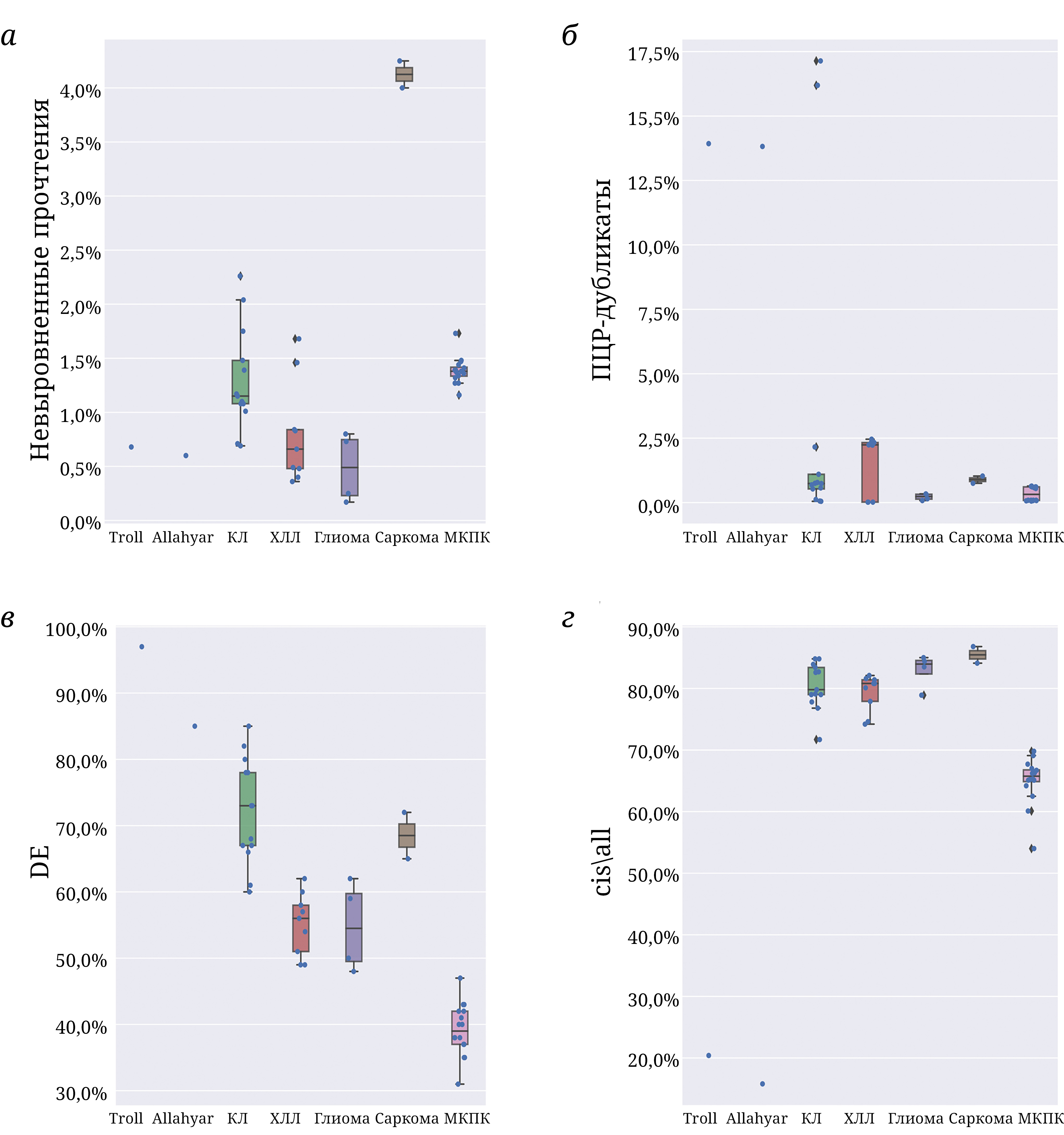 Рис. 2. Показатели качества Hi-C библиотек: доля невыровненных прочтений (а), доля ПЦР-дубликатов (б), доля DE (в), доля cis-контактов среди Hi-C-контактов (г). Число проанализированных библиотек из мононуклеаров крови (МКПК) – 16, из FFPE-срезов: КЛ – 13, ХЛЛ – 9, глиомы – 4, саркомы – 2