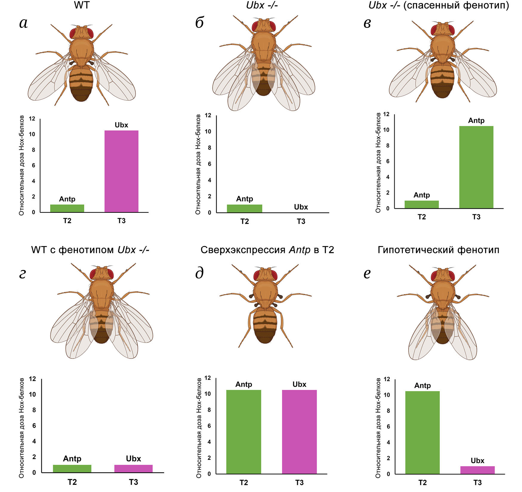 У беспозвоночных животных самый наглядный пример дозозависимой функции Hox-белков – регуляция морфологии крыльев. Эта функция описана у насекомых из разных клад и, по всей видимости, является универсальной для диверсификации формы и размера крыльев на втором (T2) и третьем (T3) грудных сегментах [92]. В её выполнении задействованы белки Antp и Ubx. У Drosophila дикого типа белок Antp присутствует только в Т2, а белок Ubx – в Т3, причём концентрация Antp в T2 ниже, чем концентрация Ubx в Т3 (рис. 1, а) [95]. У мутантов Ubx-/- вместо гальтер на Т3 образуется пара крыльев (рис. 1, б). Если у таких мутантов повысить дозу Antp в Т3 до уровня Ubx, то восстанавливается нормальный фенотип (на Т3 образуются гальтеры (рис. 1, в)) [95]. Наоборот, при снижении дозы Ubx в Т3 вместо гальтер вырастают летательные крылья (рис. 1, г) [95]. Также при повышении дозы Antp в T2 вместо крыльев появляются гальтеры (рис. 1, д) [95].