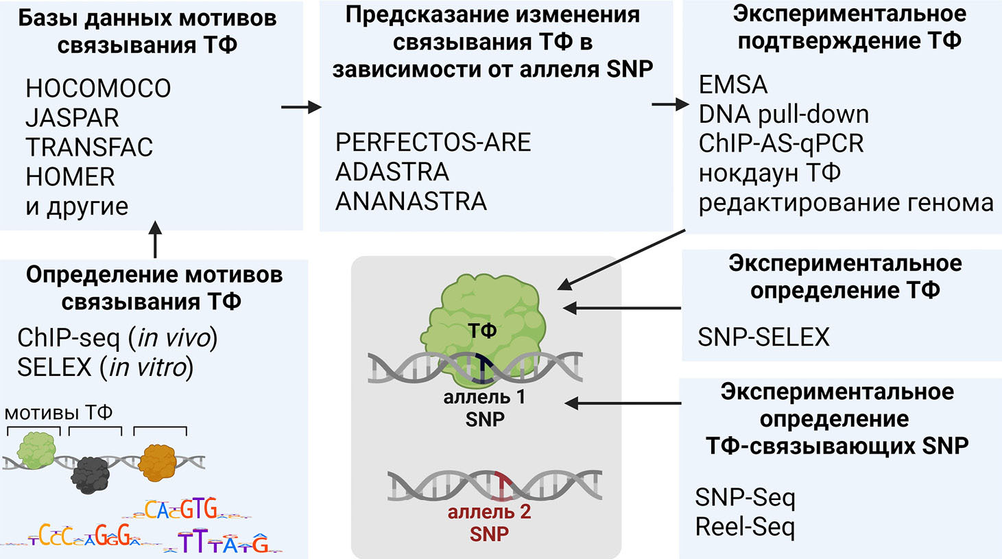 Существуют разнообразные in silico подходы для предсказания предпочтительных мотивов связывания ТФ, в большинстве случаев основанные на позиционных весовых матрицах (PWM, Positional Weight Matrix), формируемых с помощью множественного выравнивания ТФ-связывающих последовательностей [72, 73]. В свою очередь, информация о конкретных ТФ-связывающих последовательностях может быть получена с помощью высокопроизводительных методов полногеномного картирования сайтов связывания in vivo, например, основанных на иммунопреципитации хроматина ChIP (Chromatin Immunoprecipitation) или на высокопроизводительном HT-SELEX (high-throughput systematic evolution of ligands by exponential enrichment) для отбора последовательностей связывания ТФ in vitro [74]. Для идентификации последовательностей генома, связанных со специфическими белками в их нативном хроматиновом контексте, используют метод ChIP-seq, сочетающий в себе иммунопреципитацию хроматина с последующим высокопроизводительным секвенированием ДНК [75]. Последовательности, оптимальные для связывания определенного ТФ (возможно, не существующие в природе), ищут при помощи SELEX-семейства методик обогащения библиотек случайно сгенерированных олигонуклеотидов специфическими последовательностями с высоким сродством к данному ТФ [76]. К широко известным базам данных, основанных на методе PWM, относятся TRANSFAC [77], HOCOMOCO [78], JASPAR [79], HOMER [80], iRegulon [81] и др. Биоинформатические приложения позволяют оценивать потенциальное изменение силы связывания ТФ в зависимости от варианта полиморфизма. Эффективность аллель-специфического связывания ТФ может быть оценена непосредственно по данным ChIP-Seq, если глубина секвенирования позволяет обнаружить статистически значимые отклонения в частотах альтернативных аллелей SNP в сайте связывания [82, 83]. Комбинация ChIP с количественным определением аллелей, ChIP-AS-qPCR (ChIP-based allele-specific quantitative PCR), позволяет измерить влияние аллельных вариантов на эффективность связывания ТФ в живой клетке [57]. Был предложен высокопроизводительный вариант анализа связывания ТФ с полиморфизмами регуляторных областей SNP-SELEX на основе HT-SELEX. Этот метод позволяет анализировать влияние порядка 100 000 аллельных вариантов потенциально регуляторных SNP (GWAS-аннотированных) на связывание нескольких сотен ТФ [84]. К экспериментальным подходам идентификации ТФ можно также отнести классический метод анализа ДНК-белковых взаимодействий, основанный на сдвиге электрофоретической подвижности – EMSA (electrophoretic mobility shift assay). В процессе EMSA происходит специфическое связывание исследуемых белков с меченой олигонуклеотидной пробой с последующим анализом подвижности таких фрагментов при электрофорезе в полиакриламидном геле в нативных условиях, причем количество образующегося комплекса позволяет оценить относительную силу связывания [85]. Специфичность определения белковых компонентов в комплексах достигается путем добавления антитела к конкретному белку в реакции: EMSA–supershift [86]. Также существуют высокопроизводительные методы анализа большого количества SNP на предмет влияния аллельных вариантов на связывание ТФ, основанные на инкубации SNP-содержащих олигонуклеотидов с ядерным экстрактом из интересующего типа клеток, с последующим анализом обогащенных библиотек c помощью секвенирования; к таким методам относятся SNPs-Seq [57] и Reel-Seq [87]. Ни один из этих методов сам по себе не позволяет у