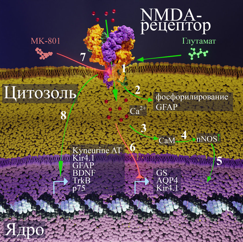 Рис. 1. Влияние ингибирования и активации NMDA-рецепторов астроцитов на внутриклеточные процессы. Активация NMDA-рецепторов глутаматом приводит к притоку кальция в клетку (1). Повышение внутриклеточного кальция приводит к фосфорилированию GFAP (2) и активации кальмодулина (3), который, в свою очередь, активирует nNOS (4), что сопровождается ее транслокацией в ядро (5). Также активация NMDA-рецепторов глутаматом сопровождается снижением экспрессии глутаминсинтазы, AQP4 и Kir4.1-каналов (6) как на генном, так и на белковом уровне. В свою очередь, ингибирование поры рецептора с помощью МК-801 (7), наоборот, повышает экспрессию аминотрансферазы кинуренина, Kir4.1-каналов, BDNF, GFAP, TrkB и р75 (8) как на генном, так и на белковом уровне