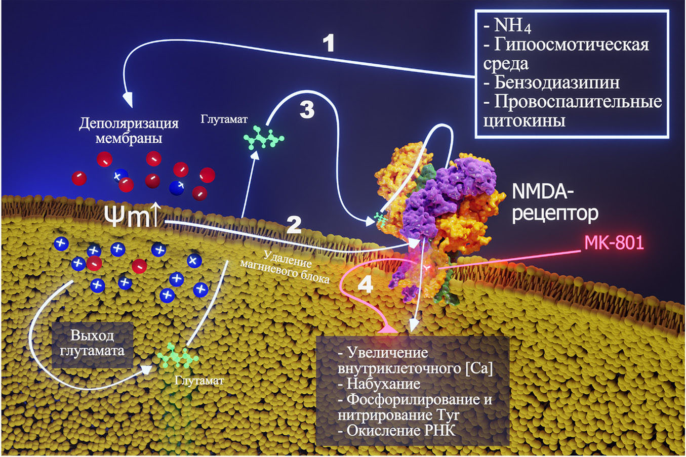 Рис. 2. Предполагаемая роль NMDA-рецепторов при гипераммониемии. 1 – Ионы аммония, воздействие гипоосмотической среды, бензодиазепины и провоспалительные цитокины вызывают деполяризацию астроцитов. 2 – Деполяризация снимает магниевый блок с NMDA-рецепторов, в результате чего происходит их активация с последующим каскадом реакций, приводящих к повышению внутриклеточного кальция, набуханию, фосфорилированию и нитрированию белков, а также окислению РНК. 3 – Мембранная деполяризация может опосредованно приводить к секреции глутамата, который, в свою очередь, активирует NMDA-рецепторы и опосредует нижеследующие эффекты. 4 – MK-801, в свою очередь, блокирует пору NMDA-рецепторов и предотвращает все эффекты, вызываемые аммонием и другими воздействиями