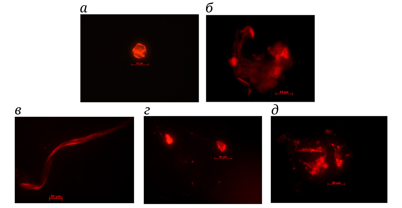 В спектре комплекса ThT и образца YpOmpFt, полученного при обработке по типу (3) с последующей выдержкой в течение 10 суток, наблюдалось смещение максимума флуоресценции в длинноволновую область при значительном увеличении интенсивности его флуоресценции по сравнению с контролем (рис. 1, г). С помощью флуоресцентной микроскопии в полученном образце YpOmpFt были обнаружены разнообразные агрегаты, в том числе удлиненной формы, интенсивно связывающие краситель, однако типичных фибриллярных структур не наблюдалось (рис. 2, д).