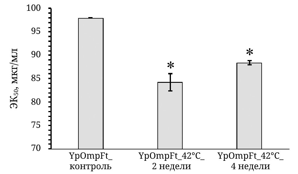 Рис. 3. Цитотоксичность YpOmpFt по отношению к культуре клеток млекопитающих (нейробластома мыши Neuro-2aCCL-131™ («АТСС», США)). Цитотоксическую активность выражали как эффективную концентрацию (ЭК50), при которой метаболическая активность клеток ингибируется на 50%. Долю мертвых клеток нормализовали в каждом случае относительно отрицательного контроля (фосфатно-солевой буфер). Данные представлены как среднее ± стандартное отклонение из трех экспериментальных повторов; достоверность различий между опытными и контрольной группами оценивали с помощью t-критерия Стъюдента (* р ≤ 0,05)