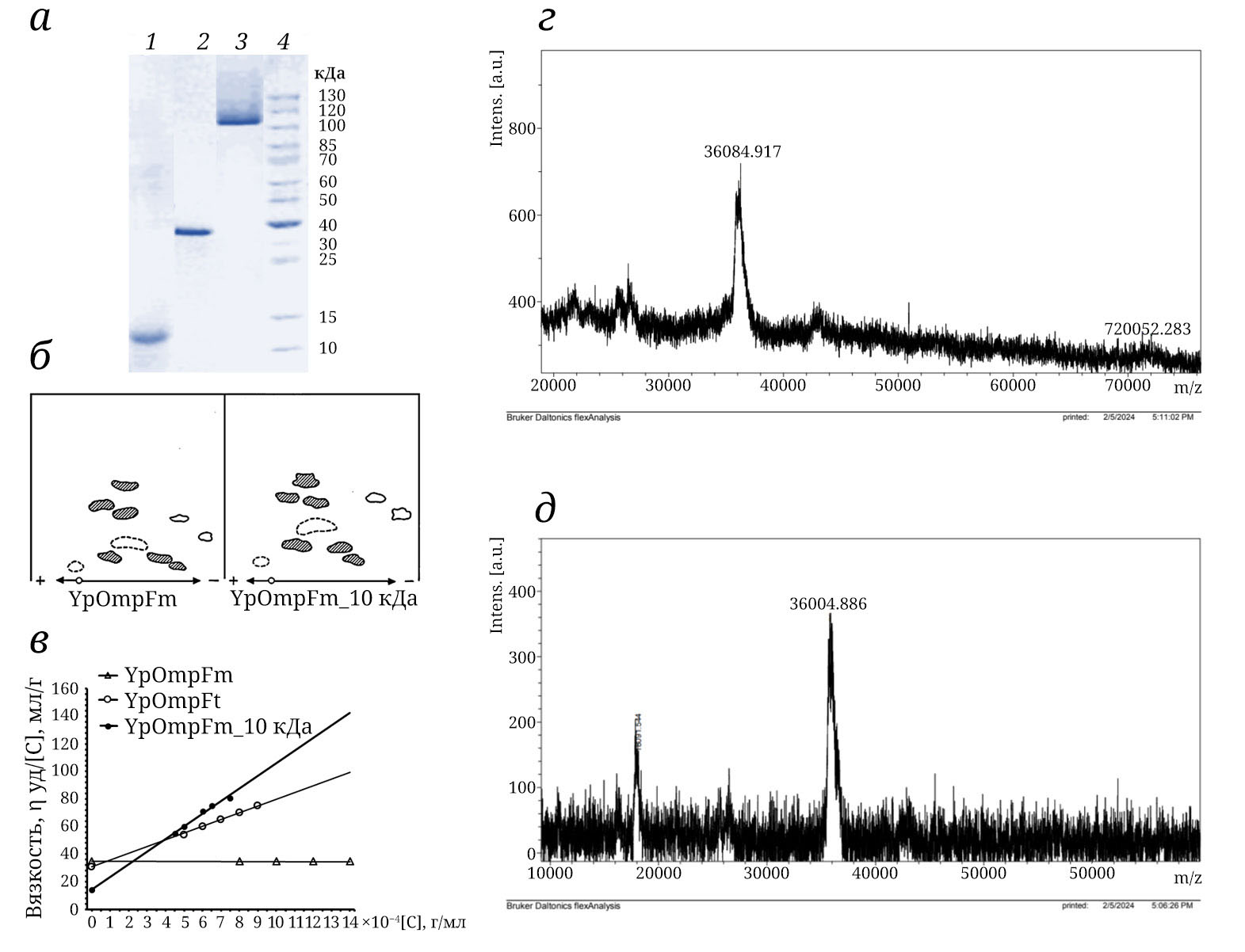 Рис. 4. Физико-химическая характеристика различных молекулярных форм порина из Y. pseudotuberculosis. а – Электрофореграмма различных молекулярных форм порина из Y. pseudotuberculosis: 1 – YpOmpFm_10 кДа, денатурированный тример порина, после обработки при pH 4,5 в течение 5 ч при 95 °C с последующей выдержкой при 25 °C в течение 10 суток; 2 – YpOmpFm; 3 – YpOmpFt; 4 – белки-маркеры. б – Пептидные карты продуктов триптического гидролиза денатурированного теплом мономера, YpOmpFm и полипептида YpOmpFm_10 кДа. в – Определение характеристической вязкости различных молекулярных форм порина OmpF из Y. pseudotuberculosis. г – ВП-МАЛДИ-спектры YpOmpFt и полипептида YpOmpFm_10 кДа