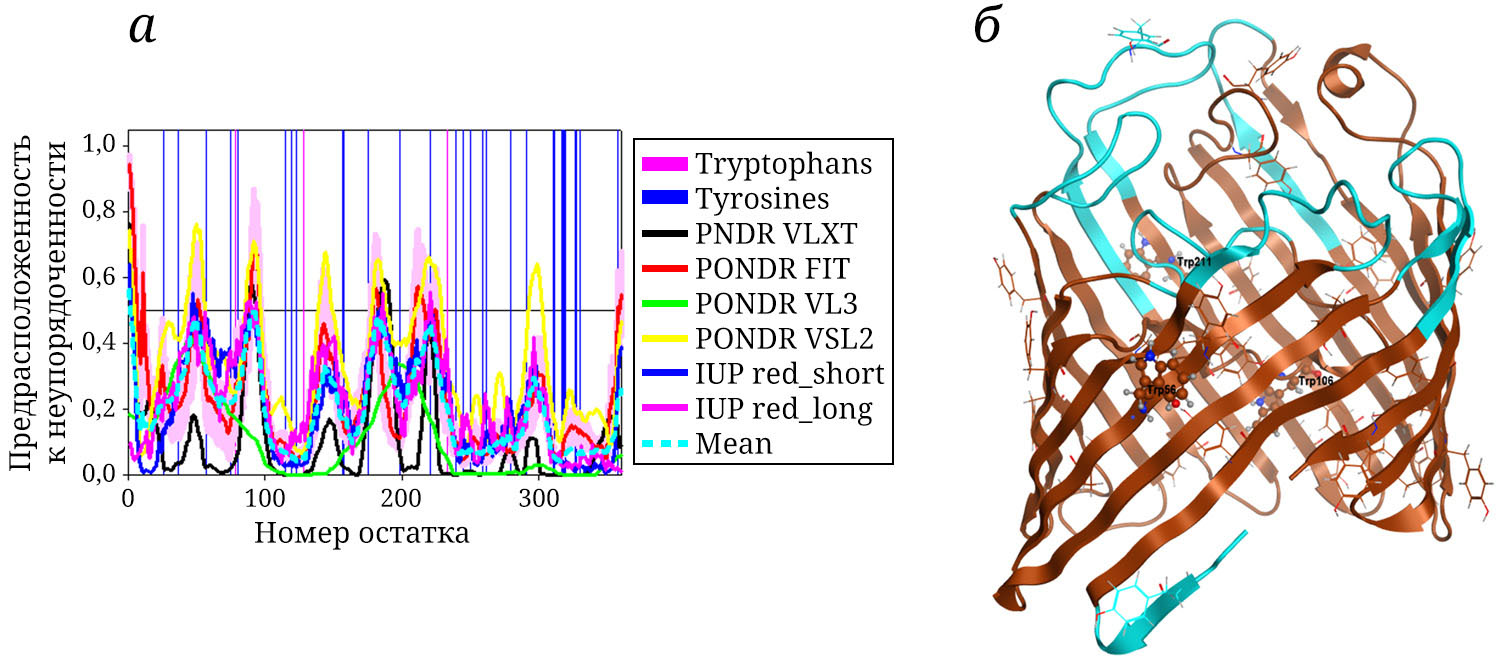 Рис. 6. Модель пространственной структуры и анализ предрасположенности порина OmpF Y. pseudotuberculosis (IB серовара O-серотипа, штамм IP 31758; UniProtIDA0A0U1QUP9) к внутренней разупорядоченности. а – Результаты анализа аминокислотной последовательности порина YpOmpF, полученные с помощью биоинформатических инструментов. Высокие значения вероятности внутренней разупорядоченности (>0,5) на графике соответствуют участкам аминокислотной последовательности с внутренне неупорядоченной структурой, тогда как значения вероятности внутренней разупорядоченности от 0,15 до 0,5 присущи участкам аминокислотной последовательности с повышенной структурной гибкостью. Кривые различных цветов соответствуют расчетам, сделанным различными предсказательными программами: PONDR® VLS2 [45, 46], PONDR® VL3 [47], PONDR® VLXT [48], PONDR® FIT [49], IUPred-Long и IUPred-Short [50]. Веб-приложение Rapid Insorder Analysis Online (RIDAO) использовали для суммирования результатов, полученных с помощью каждой предсказательной программы [51]. б – Теоретическая модель порина YpOmpF представлена в виде ленточной диаграммы и окрашена в соответствии с предрасположенностью данных участков структуры к внутренней неупорядоченности: коричневым цветом отмечены упорядоченные участки, структурно-пластичные – голубым. Остатки Trp приведены в шаро-стержневом представлении, а остатки Tyr – в стержневом представлении. Последовательности поринов OmpF из штаммов Y. pseudotuberculosis 1b IP 31758, UniProtIDA0A0U1QUP9 и 1b 598 идентичны