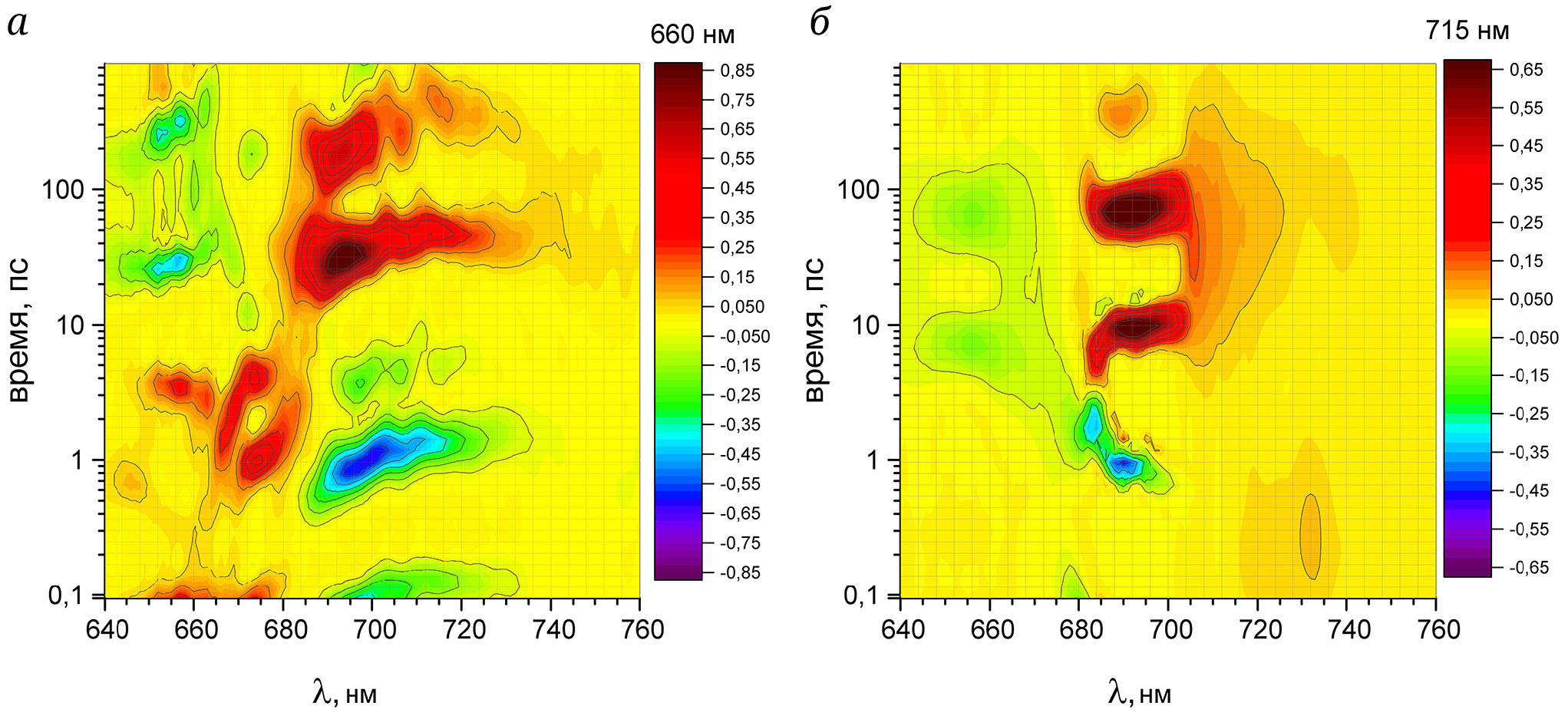 Рис. 2. Спектральные изменения ФС1 из C. ohadii вблизи полосы Qy, инициированные возбуждением с максимумом на 660 нм (а) и 715 нм (б). Шкала амплитуд показана справа от цветовых карт