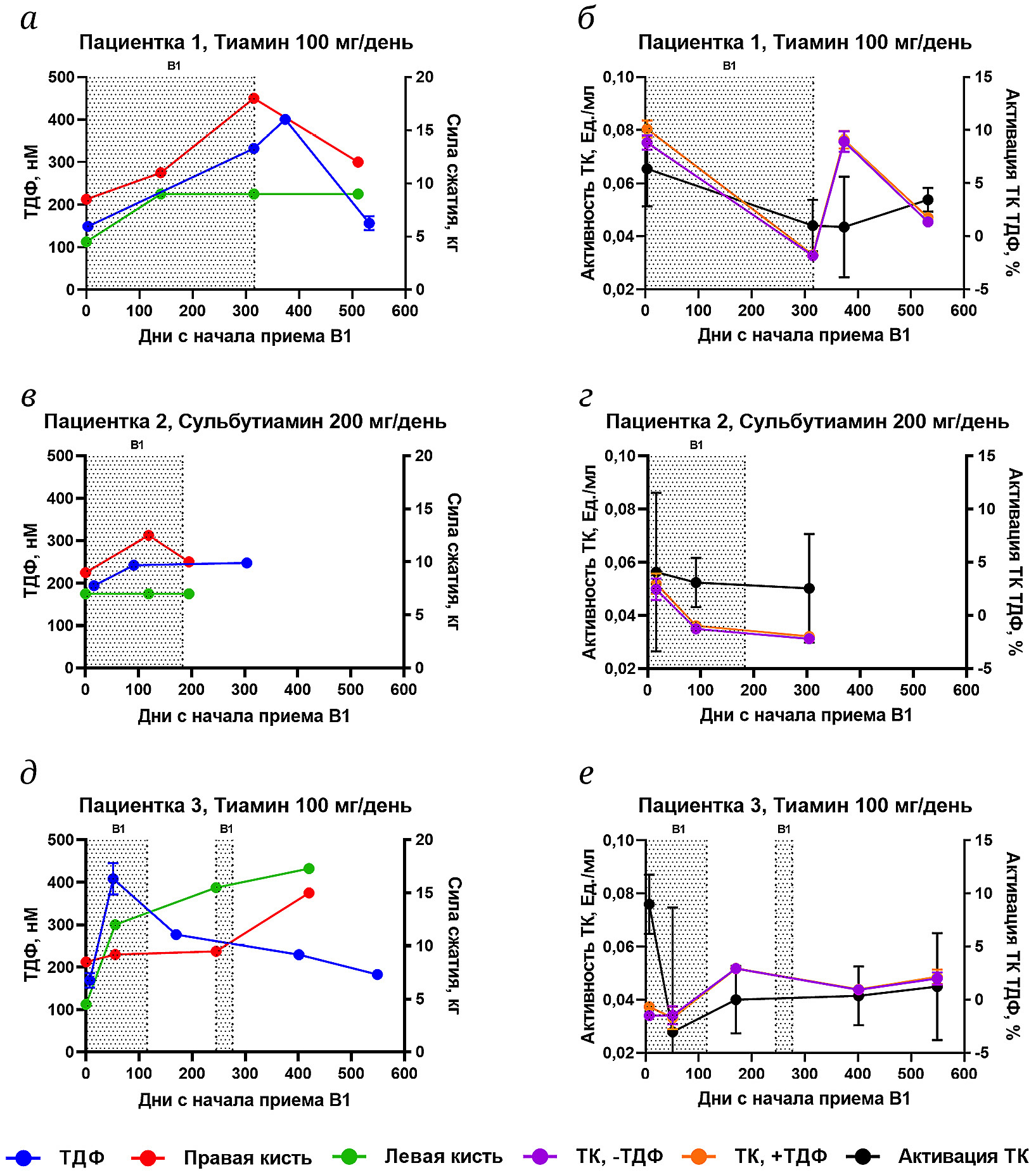 Рис. 1. Динамика изменения тиаминового статуса в крови и силы мышц-сгибателей пальцев кистей у пациенток 1 (а и б), 2 (в и г) и 3 (д и е) во время и после завершения курсов ежедневного перорального приема витамина В1 в форме тиамина гидрохлорида (пациентки 1, 3) или сульбутиамина (пациентка 2). Точечной штриховкой обозначены периоды, когда пациентки принимали B1. (а, в, д) – Содержание ТДФ в крови (левая шкала по оси Y, синяя линия) и сила мышц-сгибателей пальцев кистей (правая шкала по оси Y), правой (красная линия) и левой (зеленая линия) кистей. (б, г, е) – Активность транскетолазы (ТК) крови (левая шкала по оси Y), измеренная при отсутствии (–ТДФ, сиреневая линия) и в присутствии (+ТДФ, оранжевая линия) ТДФ в реакционной среде; измерения используются для расчета активации транскетолазы ТДФ, характеризующей долю апо-транскетолазы от общего количества фермента (правая шкала по оси Y, черная линия), как описано в разделе «Материалы и методы» («Анализ транскетолазы крови»). Все биохимические параметры представлены как среднее значение ± стандартная ошибка среднего (полосы ошибок не отображаются, если находятся в пределах размера символов)