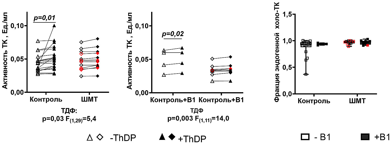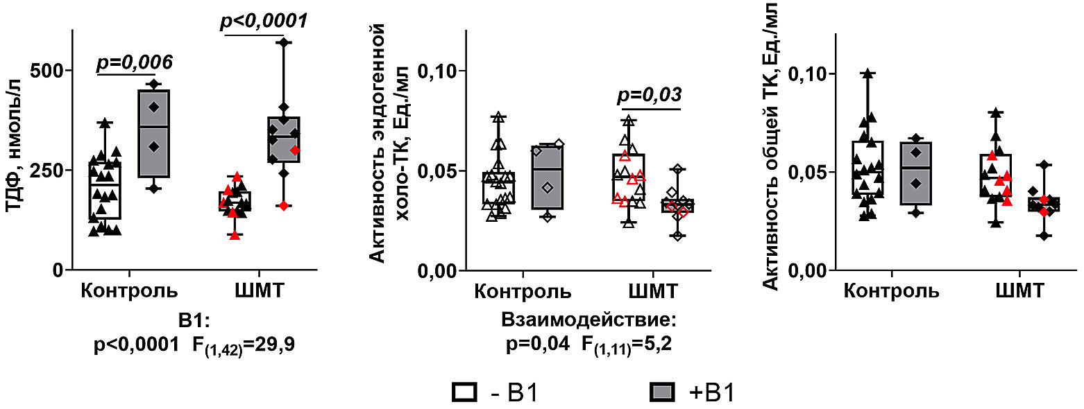 Рис. 3. Сравнение активации транскетолазы (ТК) добавлением ТДФ в среду измерения активности у участников контрольной группы и пациентов с ШМТ. Значения активности ТК, определенные без и при добавлении ТДФ в среду, показаны пустыми и закрашенными символами соответственно. Черные и красные символы обозначают ШМТ1 и ШМТ2 соответственно. При сравнении эндогенной холо-транскетолазы (холо-TK) прием B1 in vivo обозначен полыми и закрашенными прямоугольниками, как показано в легенде под графиком. У лиц, получавших B1 и имеющих несколько временных точек, доступных во время наблюдения за пациентом, для сравнений выбиралась точка, соответствующая максимальному уровню ТДФ в крови. Статистически значимые (р ≤ 0,05) различия между изучаемыми группами, определенные методом двустороннего дисперсионного анализа с парными измерениями (RM-ANOVA) с критерием множественных сравнений Сидака, представлены на графиках. Под графиками указаны значимые факторы с их статистикой. Число испытуемых в исследуемых группах такое же, как на рис. 2