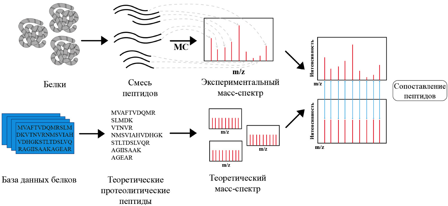 Одной из первых реализаций идеи ультракороткого протеомного анализа являлся подход на основе пептидных отпечатков белков (PMF) [4, 21, 22]. Этот подход заключается в предварительном разделении белков с помощью гель-электрофореза или жидкостной хроматографии, специфическом гидролизе белковых фракций на протеолитические пептиды (обычно используется фермент трипсин), что образует уникальный для каждого белка набор масс его пептидных фрагментов, и регистрации масс-спектров ионов пептидов. Для идентификации белков экспериментально полученные массы ионов пептидов сравниваются с теоретическими, полученными на основе имеющихся баз данных последовательностей белков протеома соответствующего организма, что схематично представлено на рис. 1 [23].