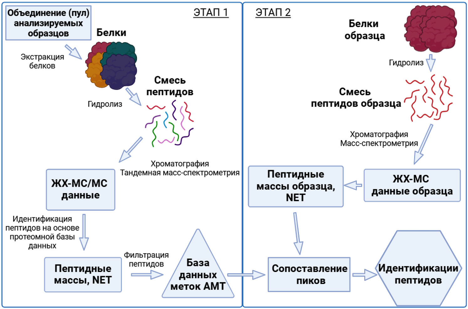 Стандартная реализация метода AMT содержит 2 основных этапа (рис. 2): (1) создание «пул»-специфичной базы данных меток AMT пептидов для пулов образцов контрольной и тестовой групп с использованием глубокого (как правило, на основе фракционирования) полнопротеомного МС/МС-анализа; и (2) быстрый анализ ВЭЖХ-МС1 образцов (МС1 – масс-спектры первого уровня ионов-предшественников) с идентификацией белков на основе созданной на первом этапе «пул»-специфичной базы данных меток AMT. На первом этапе с каждым из идентифицированных пептидов сопоставляется его точная масса в пределах ошибки измерения и нормализованное время выхода (NET, Normalized Elution Time). Затем следует этап ВЭЖХ-МС1-анализа большой когорты нефракционированных образцов, результатом которого является получение списка экспериментальных точных масс и зарядовых состояний пептидов, а также времён элюирования. Последние приводятся к нормализованной шкале времён, в наиболее простом исполнении – линейным преобразованием. Также могут использоваться NET, предсказанные на основе нейронных сетей и ранее полученных экспериментальных наборов данных идентифицированных пептидов [27]. Идентификация пептидов проанализированного образца осуществляется на основе сравнения экспериментальных наборов данных с базой меток AMT, после чего осуществляется идентификация белков и их количественный анализ. Количественные характеристики идентифицированных белков определяются на основе интенсивностей ионов пептидов в масс-спектрах.