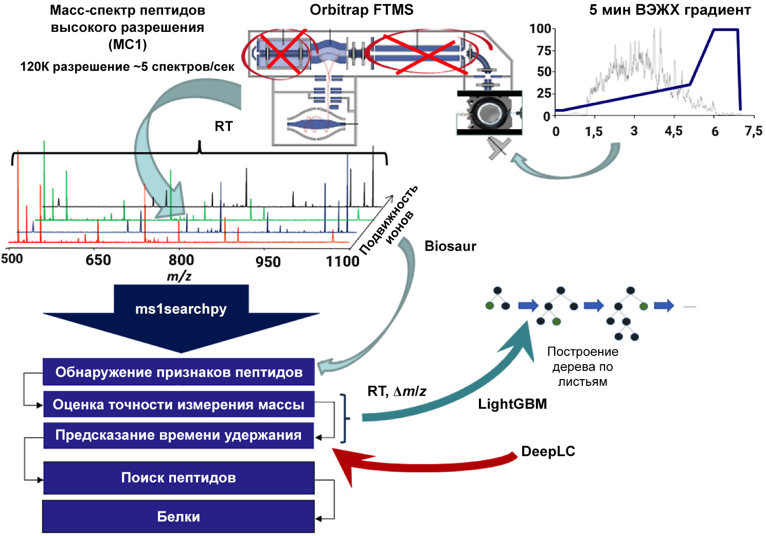 Рис. 4. Схема реализации метода DirectMS1. Ключевым фактором эффективности метода является использование алгоритмов машинного обучения для предсказания времён элюирования пептидов и классификации правильных и ложных идентификаций на основе совокупности комплементарных данных, таких как спектральный профиль иона пептида по изотопу углерода 13С, времена элюирования, ионная подвижность (при использовании дополнительного разделения по ионной подвижности) и точные массы пептидов