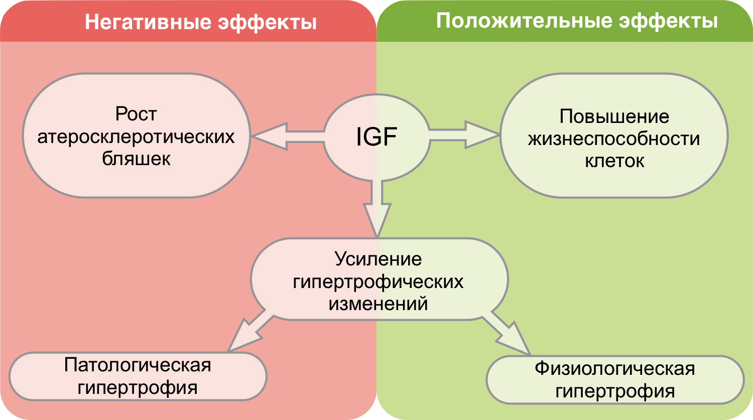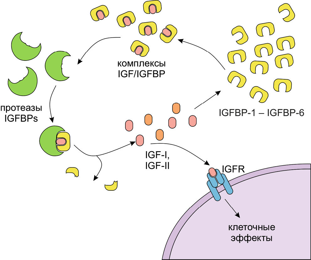Как уже упоминалось выше, инсулиноподобные факторы роста оказывают широкий спектр эффектов на такие клеточные процессы в тканях организма, как клеточный рост, поддержание жизнеспособности клеток, а также их дифференцировку. Ключевым регуляторным механизмом активации IGF-сигнального пути в тканях организма является обеспечение биодоступности IGF для их клеточных рецепторов. Регуляция данного процесса осуществляется, с одной стороны, за счёт высвобождения лигандов (IGF), а с другой – за счёт их связывания c лиганд-связывающими белками (IGFBP).