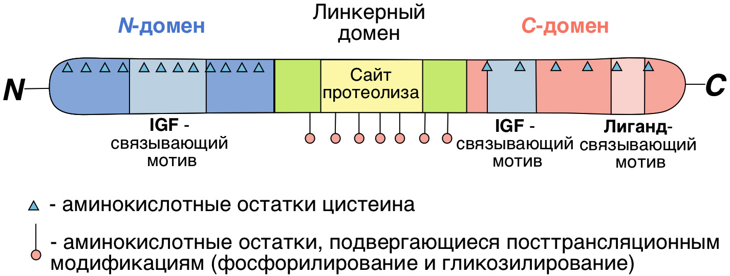 IGF-связывающие белки. Как уже упоминалось выше, IGF взаимодействуют с шестью представителями семейства IGF-связывающих белков. В организме человека каждый из шести IGFBP (IGFBP-1–IGFBP-6) кодируется определённым геном, в то время как у других представителей позвоночных несколько генов отвечают за экспрессию определённого белка IGFBP или трансляция некоторых IGFBP не осуществляется. Несмотря на то что для всех представителей семейства IGFBP характерна значительная гомология аминокислотного состава, они отличаются по своей структуре и функциям. Различие функций представителей IGFBP внутри семейства обусловлено наличием определённых мотивов в их белковой структуре. Все представители семейства IGFBP имеют консервативные N- и С-домены, содержащие 12 и 6 аминокислотных остатков цистеина соответственно и вариабельный линкерный домен. N-Домен включает в себя IGF-связывающий мотив. Линкерный домен содержит аминокислотные остатки, которые могут подвергаться посттрансляционным модификациям, участки связывания с гепарином, а также в нём могут быть локализованы сайты протеолитического расщепления. С-Домен имеет дополнительный IGF-связывающий мотив, тиреоглобулиновый мотив, который отвечает за взаимодействие с гепарином, а также может включать в себя сигнальную последовательность, необходимую для транслокации IGFBP в ядро (рис. 2) [58].