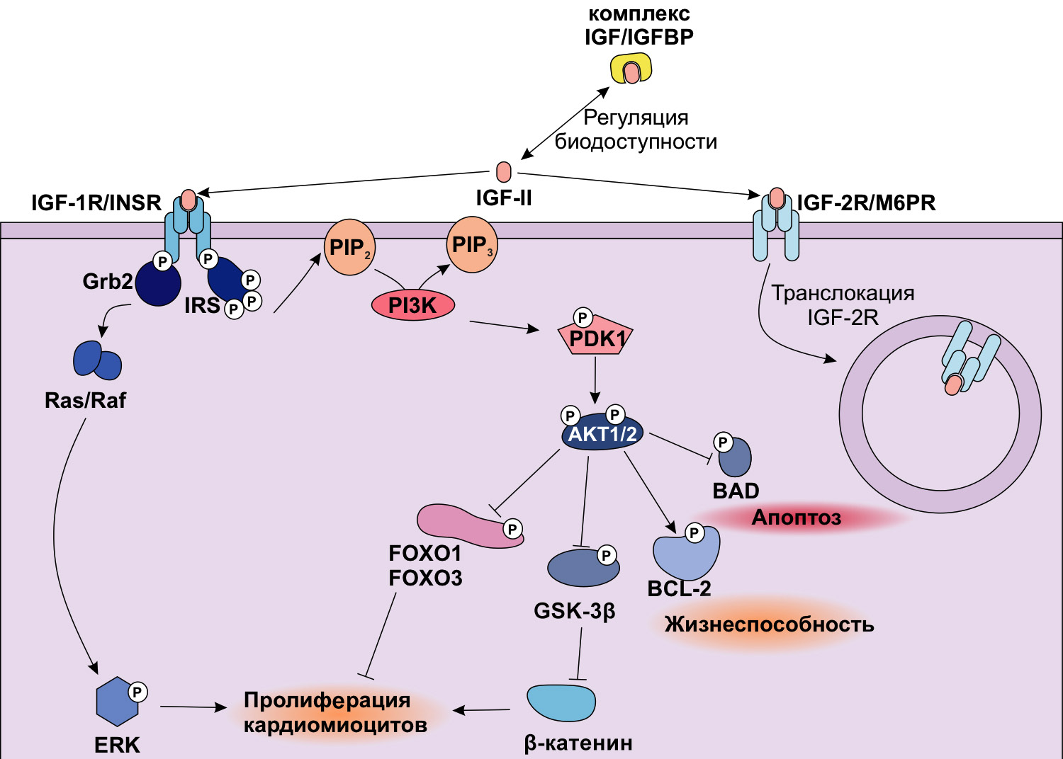 IGF-II является основным фактором, запускающим митотическое деление кардиомиоцитов во время роста плода [42–44]. Показано, что уровни мРНК IGF-II в эмбриональной ткани желудочков намного выше, чем уровни IGF-I, а также, что экспрессия IGF-II в сердечной ткани снижается после рождения [44]. IGF-II запускает пролиферацию кардиомиоцитов плода, взаимодействуя с рецептором IGF-1R и инсулиновым рецептором. Дальнейшая передача сигнала от IGF приводит к активации путей ERK/MAPK (mitogen-activated protein kinase) и PI3K (фосфоинозитид-3 киназа)/AKT (серин-треониновая протеинкиназа В). Активированный AКТ способствует локализации в цитоплазме и инактивации FOXO-факторов, негативных регуляторов пролиферации миокарда [45], что и является фактором, запускающим пролиферацию кардиомиоцитов.