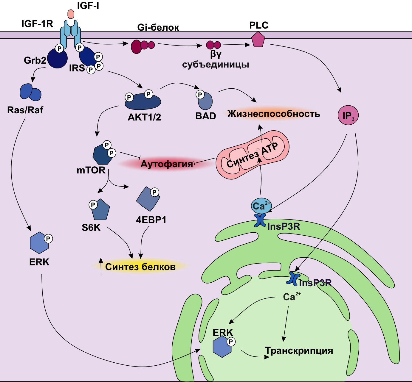 Для передачи сигнала рецептором IGF-1R существует два канонических пути: PI3K/AKT и ERK. Также в ряде работ описан неканонический путь IGF-клеточной сигнализации, ассоциированный с G-белками. Было показано, что некоторые эффекты IGF-I ингибируются блокатором гетеротримерных Gi-белков – Petrussis toxin (PTX) или коклюшным токсином – на некоторых клеточных линиях, что позволило сделать вывод, что активация IGF-1R запускает клеточную сигнализацию через Gi-белки. Было показано, что IGF-1R физически взаимодействует с представителями семейства G-белков – Giα и Gβ. Такое взаимодействие усиливается после взаимодействия IGF-1R и IGF-I. Передача сигнала через G-белки приводит к активации мембранной фосфолипазы С (PLC), которая повышает количество инозитол 1-, 4- и 5-трифосфата, что, в свою очередь, ведёт к Ca2+-опосредованной регуляции транскрипции (рис. 4) [30].