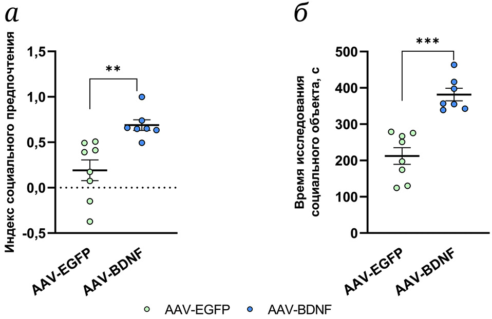 Сверхэкспрессия BDNF в коре привела к увеличению индекса социального предпочтения (t = 3,72; df = 13; p = 0,0026; рис. 2) в «трёхкамерном социальном тесте». Кроме того, животные из группы AAV-BDNF достоверно больше времени тратили на исследование социального объекта (t = 5,77; df = 13; p < 0,0001; рис. 2). Примечательно, что при центральном введении BDNF и интрагиппокампальной инъекции AAV-BDNF такого эффекта в аналогичном тесте не наблюдалось [19]. Таким образом, можно заключить, что BDNF во фронтальной коре мышей BTBR специфически регулирует распознавание и/или предпочтение социального объекта.