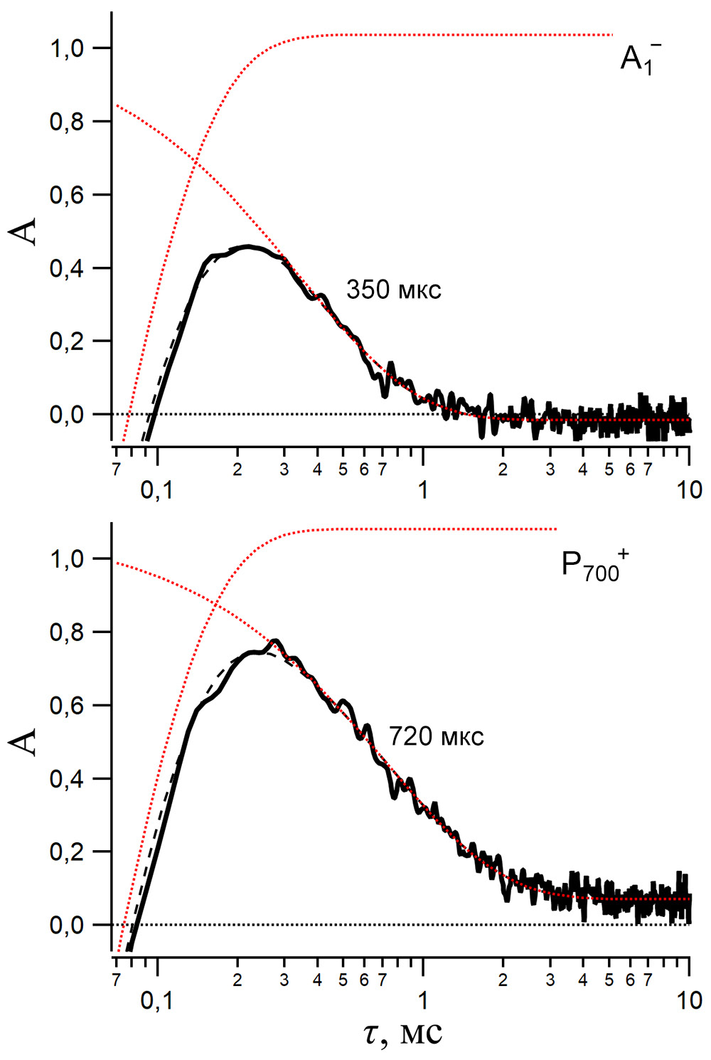 На рис. 5 представлены изменения сигналов ЭПР в комплексах A1-core, в которых конечным акцептором электрона являются молекулы филлохинона А1A и А1В. Кинетика окисления (вверху) и кинетика восстановления Р+700 (внизу) имеют близкие характерные времена τ ≈ 500 мкс. Это совпадение демонстрирует, что кинетики спада обоих сигналов ЭПР обусловлены одной и той же реакцией рекомбинации зарядов в ион-радикальной паре .