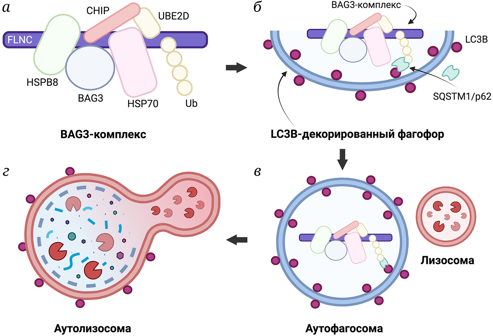 Рис. 2. Деградация поврежденных молекул FLNC в мышечных клетках путем BAG3-опосредованной шаперон-зависимой селективной аутофагии. а – Белковый комплекс BAG3–Hsp70–HspB8–CHIP–p62 (BAG3-комплекс) с убиквитинированным (Ub, ubiquitin) FLNC; BAG3 (BCL2 associated athanogene 3) – атаноген, ассоциированный c BCL2; UBE2D (ubiquitin conjugation enzyme E2D) – убиквитин-конъюгирующий фермент E2D; CHIP (carboxy-terminal Hsp70-interacting protein) – белок, взаимодействующий с С-концом Hsp70, или убиквитинлигаза E3. б – Связывание BAG3-комплекса с LC3B-декорированным фагофором; LC3B (microtubule-associated protein 1 light chain 3 beta) – легкая цепь 3 бета ассоциированного с микротрубочками белка 1; SQSTM1/р62 (sequestosome-1/ubiquitin-binding protein p62) – секвестасома-1/убиквитин-связывающий белок р62. в – Аутофагосома с BAG3-комплексом (слева) и лизосома, содержащая гидролитические ферменты (справа). г – Аутолизосома, образованная слиянием аутофагосомы и лизосомы, с лизированным содержимым. Рисунок создан в BioRender на основе работы Höhfeld et al. [47]
