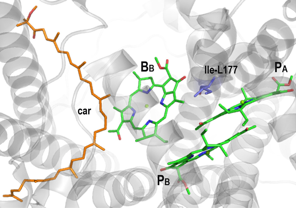Тушение триплетного состояния первичного донора РЦ является важным процессом, поскольку защищает РЦ от генерации активного синглетного кислорода в условиях высокой освещённости, когда первичный акцептор QA не успевает реокисляться цепью электронного транспорта, так что очередной квант света застаёт его в восстановленном состоянии. В результате описываемой мутации изолейцин в положении 177 L-субъединицы РЦ C. sphaeroides был замещён на гистидин. Остаток изолейцина расположен приблизительно между первичным донором Р и БХл ВВ (рис. 1). Внесение мутации I(L177)H достаточно слабо влияет на фотохимические свойства РЦ. Так, квантовый выход фотоиндуцированного переноса электрона практически не меняется по сравнению с РЦ дикого типа и остаётся близким к единице. Это подтверждается измерениями квантового выхода как в стационарном режиме, так и с временным разрешением [19, 27].