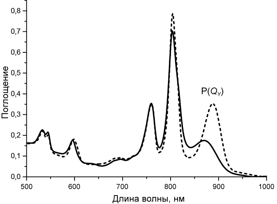 Рис. 2. Спектры поглощения РЦ C. sphaeroides дикого типа (пунктир) и мутанта I(L177)H (сплошная линия), Т = 100 К. Полосы QY первичного донора Р лежат в области 870–890 нм. Подробное описание спектра приведено в работе Vasilieva et al. [24]