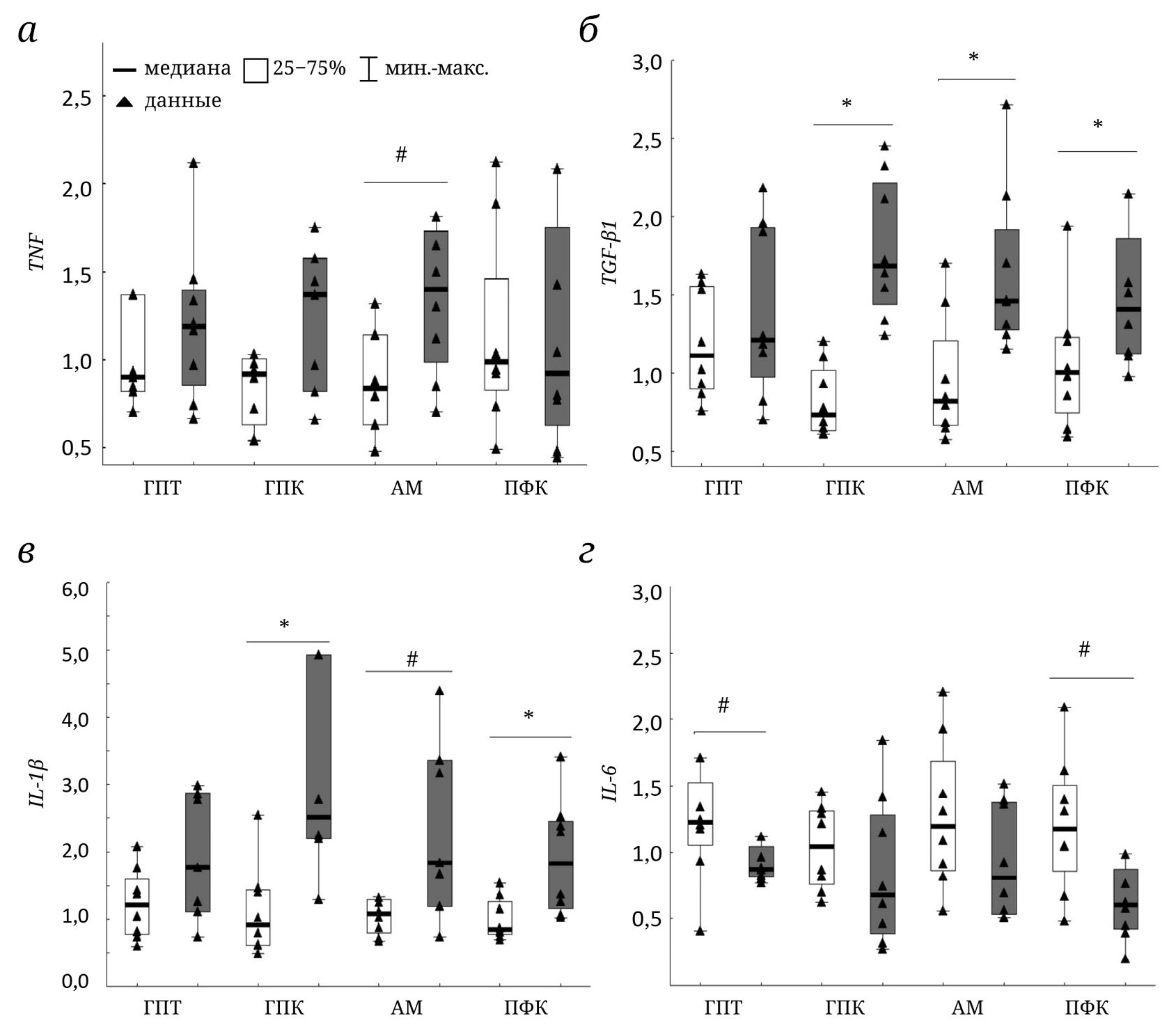 Исследовали экспрессию мРНК следующих генов: Transforming growth factor beta 1 (TGF-β1), tumor necrosis factor (TNF), Interleukin-1 beta (IL-1β), Interleukin-6 (IL-6), tyrosine 3-monooxygenase/tryptophan 5-monooxygenase activation protein zeta (YWHAZ), Hypoxanthine guanine phosphoribosyltransferase (HPRT).