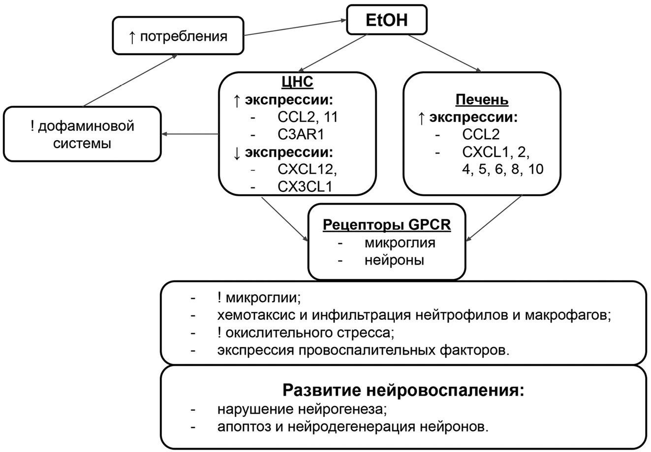 На основе представленных данных мы предлагаем схему, иллюстрирующую вклад этанол-индуцированной активации системы хемокинов в развитие нейровоспаления (рис. 1).