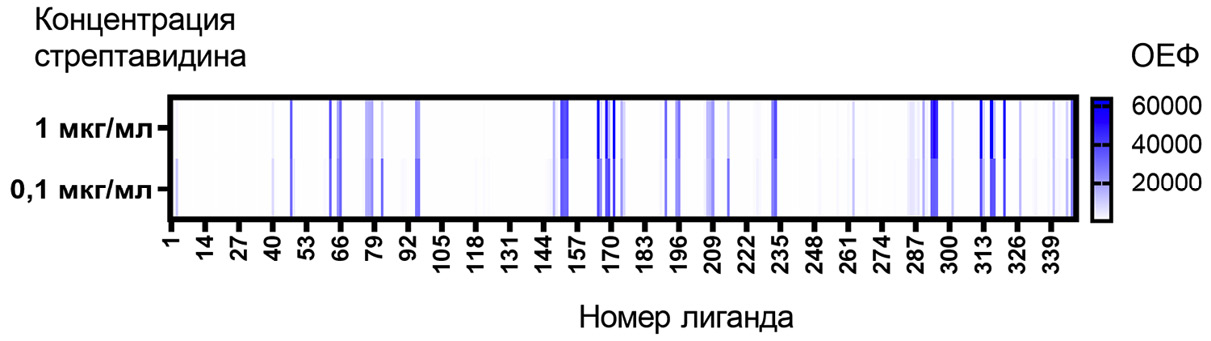 Высокая аффинность биотина по отношению к стрептавидину создаёт предпосылку уменьшения концентрации стрептавидиновых реагентов в аналитических системах, чтобы тем самым без потери аналитического сигнала понизить нежелательное связывание с гликанами. Чтобы проверить такую возможность, биотинилированный лектин RCA120 был проявлен с помощью флуоресцентно меченного стрептавидина в двух концентрациях – 1 мкг/мл (используется обычно) и 0,1 мкг/мл. На рис. 3 показано, что десятикратное снижение концентрации в целом не влияло ни на интенсивность наблюдаемого сигнала, ни на профиль взаимодействия RCA120 c гликанами.