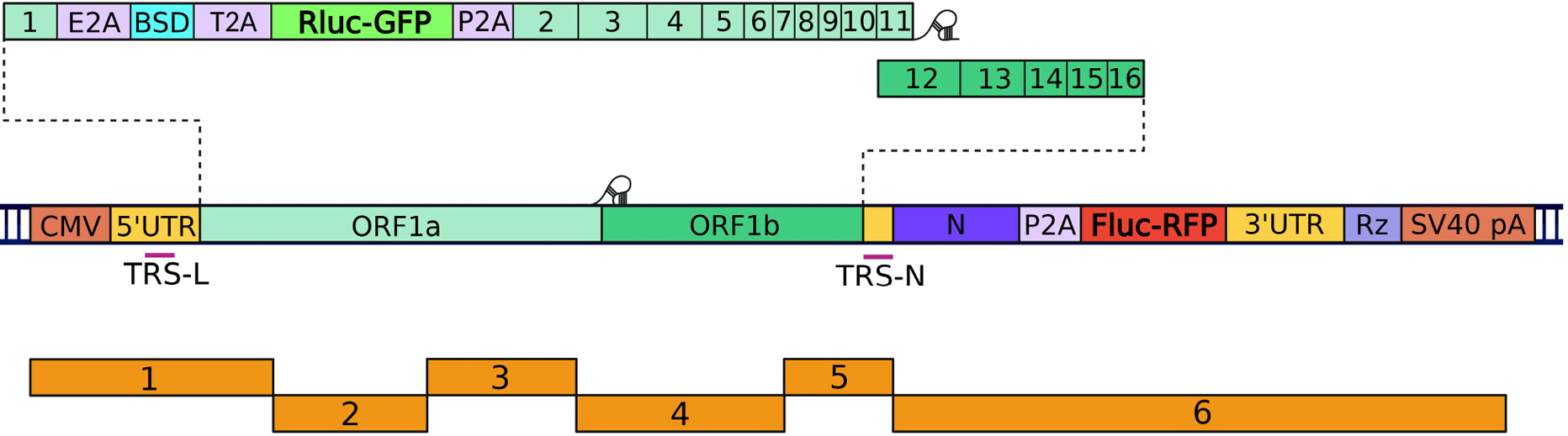 Рис. 1. Модель полноразмерного репликона SARS-CoV-2 с двумя блоками репортерных генов. Первый блок репортерных генов Rluc–GFP расположен внутри ORF1a под контролем промотора CMV, второй блок Fluc–RFP расположен между геном белка N и 3′-UTR и может транскрибироваться только вирусной RdRp с помощью механизма прерывистой транскрипции. Ниже приведена схема 6 фрагментов кДНК вируса, из которых производилась сборка полноразмерного репликона и клонирование в плазмиду pBAC_lacZ с использованием Golden Gate-подхода