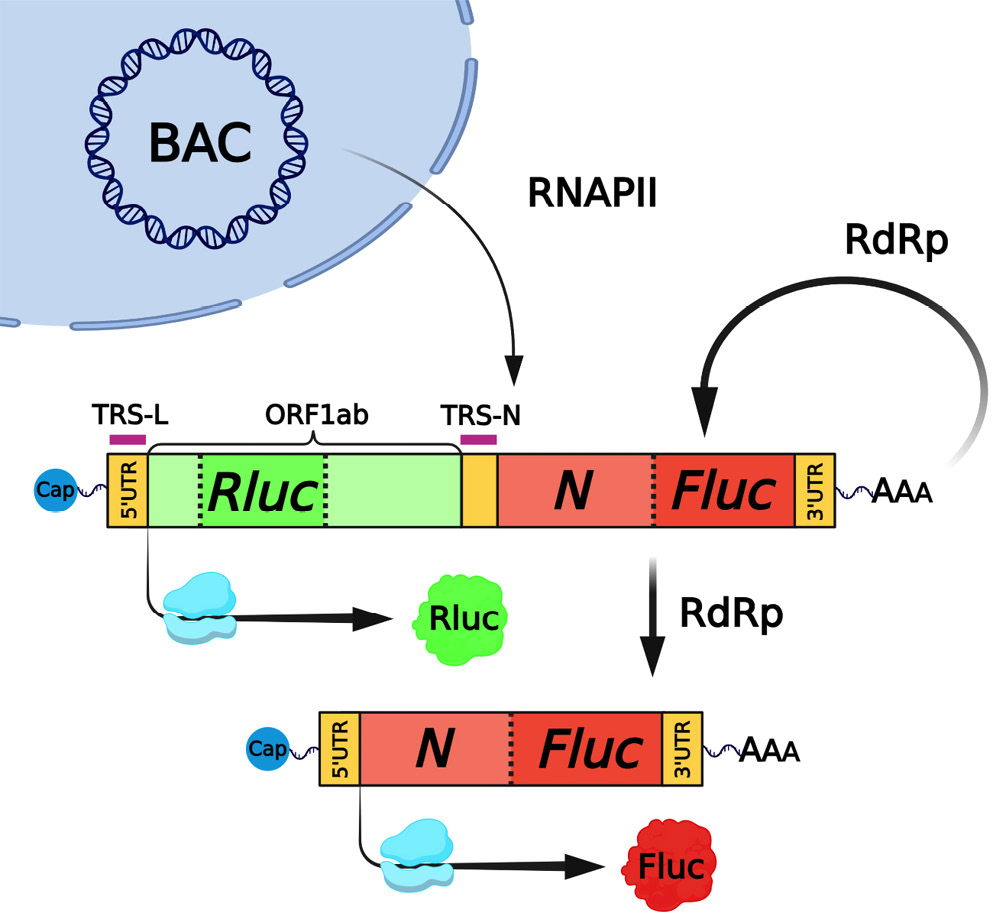 Рис. 2. Схема функционирования репликона. Экспрессия первого репортера (Rluc) может происходить как за счёт транскрипции с векторной ДНК (BAC) клеточной РНК-полимеразой II (RNAPII), так и за счёт репликации вирусной РНК под действием RdRp. Второй репортер (Fluc) может транскрибироваться только вирусной RdRp через механизм прерывистой транскрипции