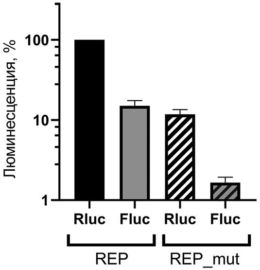Сравнение уровней экспрессии люцифераз из обоих репортерных блоков однозначно показало, что закодированная в репликоне REP полимераза функционально активна и способна осуществлять как репликацию, так и прерывистую транскрипцию вирусной РНК, продуктами которых являются люциферазы Rluc и Fluc соответственно.