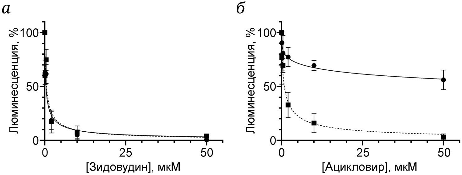 Рис. 4. Проверка ингибирующей активности зидовудина (а) и ацикловира (б) в клеточных линиях Vero E6 (сплошная линия) и Vero E6_TK (пунктирная линия), трансдуцированных репликативно-некомпетентным вектором на основе ВИЧ-1, кодирующим репортерный белок – люциферазу светлячка. Представлены средние значения по результатам не менее 3 экспериментов ± стандартное отклонение