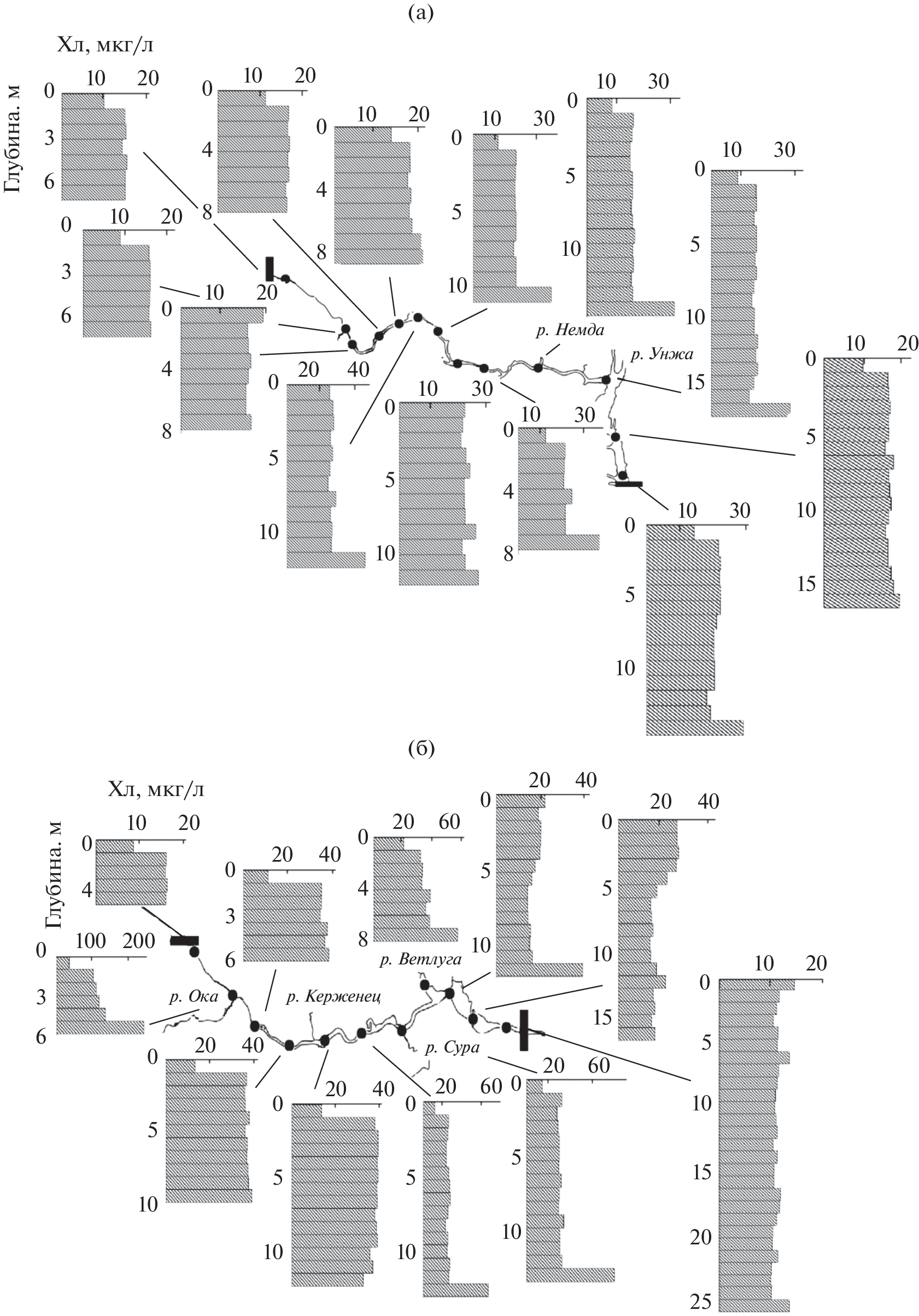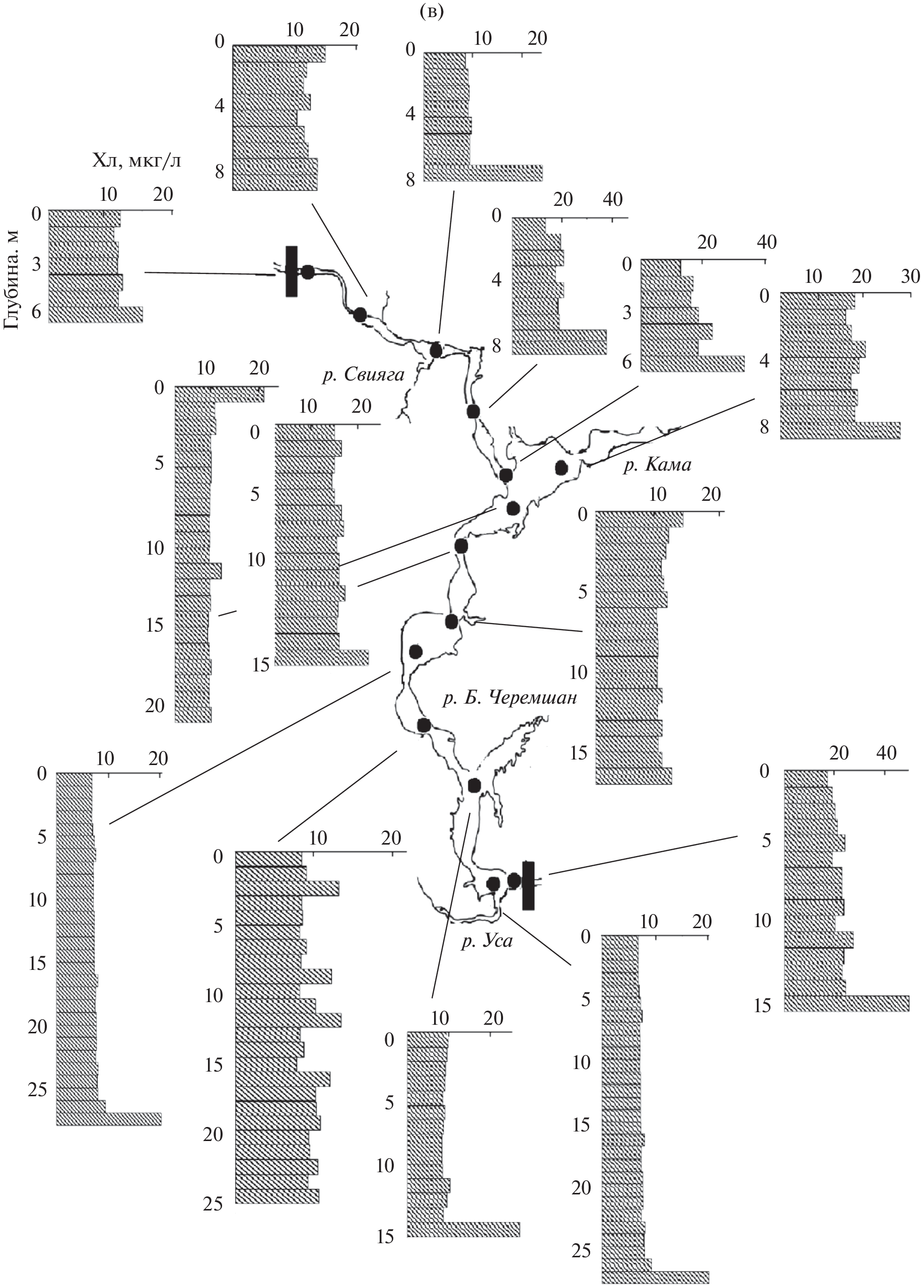 The results of the study on the vertical distribution of abiotic characteristics and chlorophyll (Chl a) in the Gorky, Cheboksary, Kuibyshev, Saratov, and Volgograd reservoirs in the summer of 2021 are presented. The content of Chl a varied from 5.5–8.5 to >100 g/L in the Middle Volga to 22 and 47 g/L in the Lower Volga, and was typical for the summer maximum of phytoplankton in the Volga reservoirs. In the absence of density stratification for most stations, a uniform Chl a distribution in the water column was revealed with variation coefficients of no more than 20%.