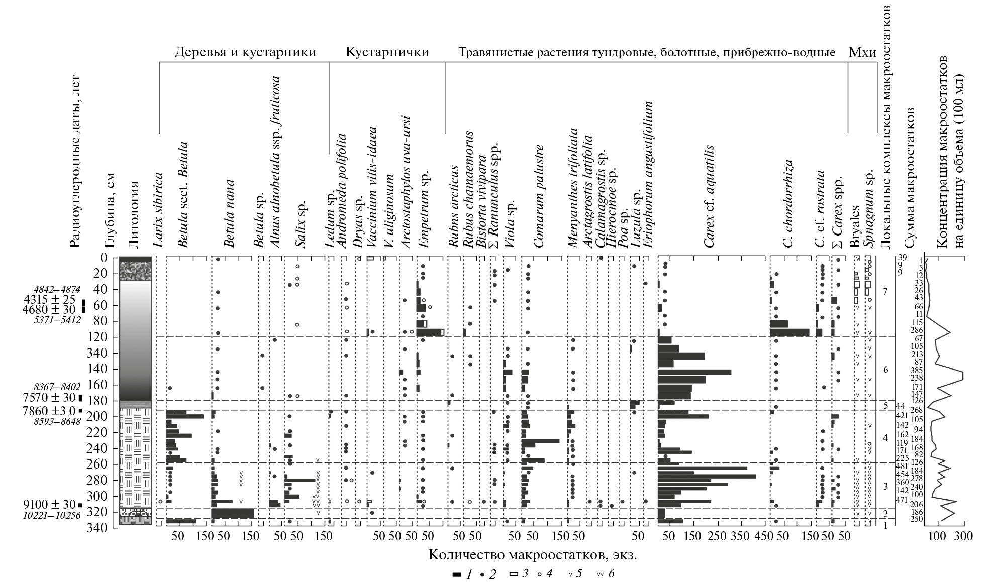 Спорово-пыльцевой и карпологический анализы. Результаты палеоботанического изучения образцов представлены на рис. 2 и 3. Определены микро- и макроостатки деревьев, кустарников, травянистых растений и мхов. По изменению соотношения доминантов и сопутствующих таксонов выделены шесть локальных пыльцевых зон (ЛПЗ) и семь локальных комплексов макроостатков (ЛКМ).