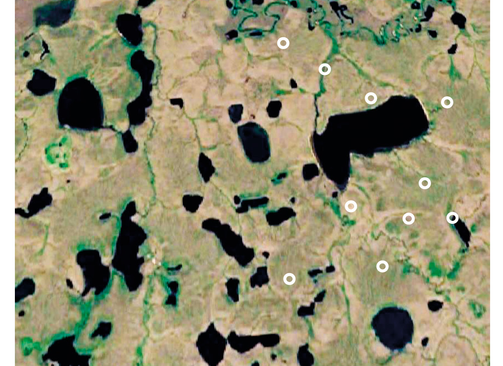 Рис. 1. Фрагмент космического снимка (https://www.google.com/intl/ru/earth/ versions/#earth-pro) центральной части участка Лукунский: серо-зеленым цветом представлена лесная растительность, светло-желтым – тундровая растительность, черным – водные объекты, зеленым – элементы гидросети, кружками красного цвета отмечены места расположения пробных площадей.